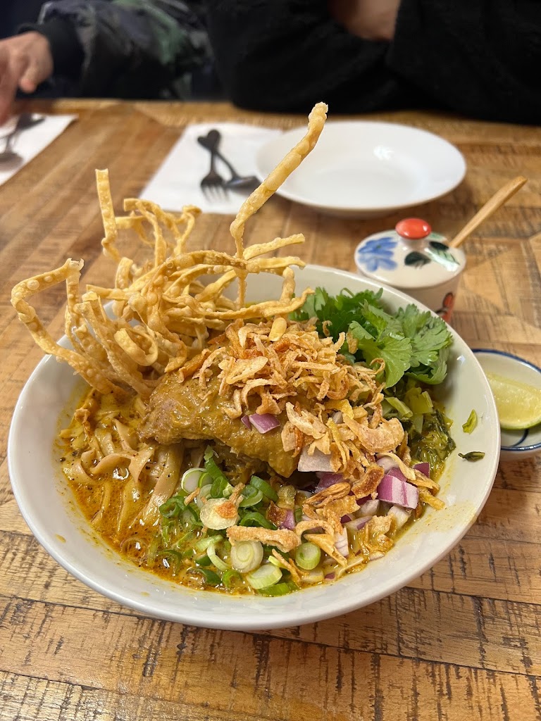 I decided to visit this place based on the glowing reviews specifically for their Khao Soi dish, and I must say, it certainly lived up to the hype. It was my first time trying Khao Soi that included bone-in chicken directly in the dish, which added an extra depth of flavor. The portion size of the chicken was impressively generous as well for a <$20 price point. The coconut curry broth was flavorful, and they provided ample servings of shallots and pickled mustard greens to enhance the dish. Overall, it was a satisfying and enjoyable culinary experience.