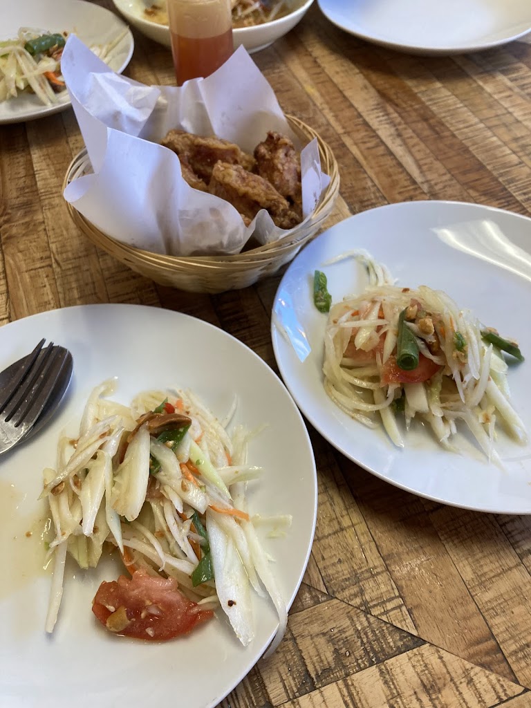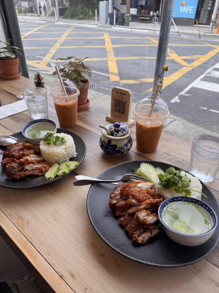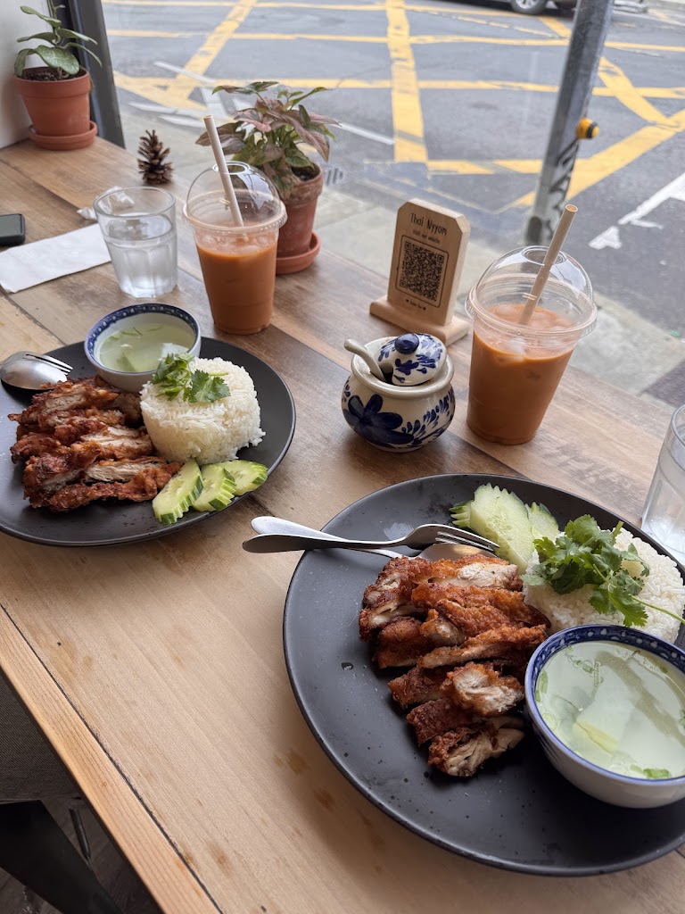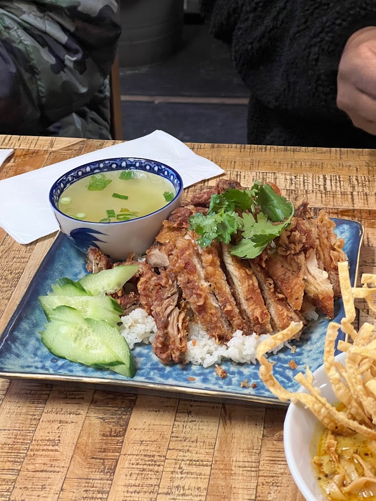 We had the chicken rice, the chicken Khao soi, and the Thai iced tea, and they are all 10/10!