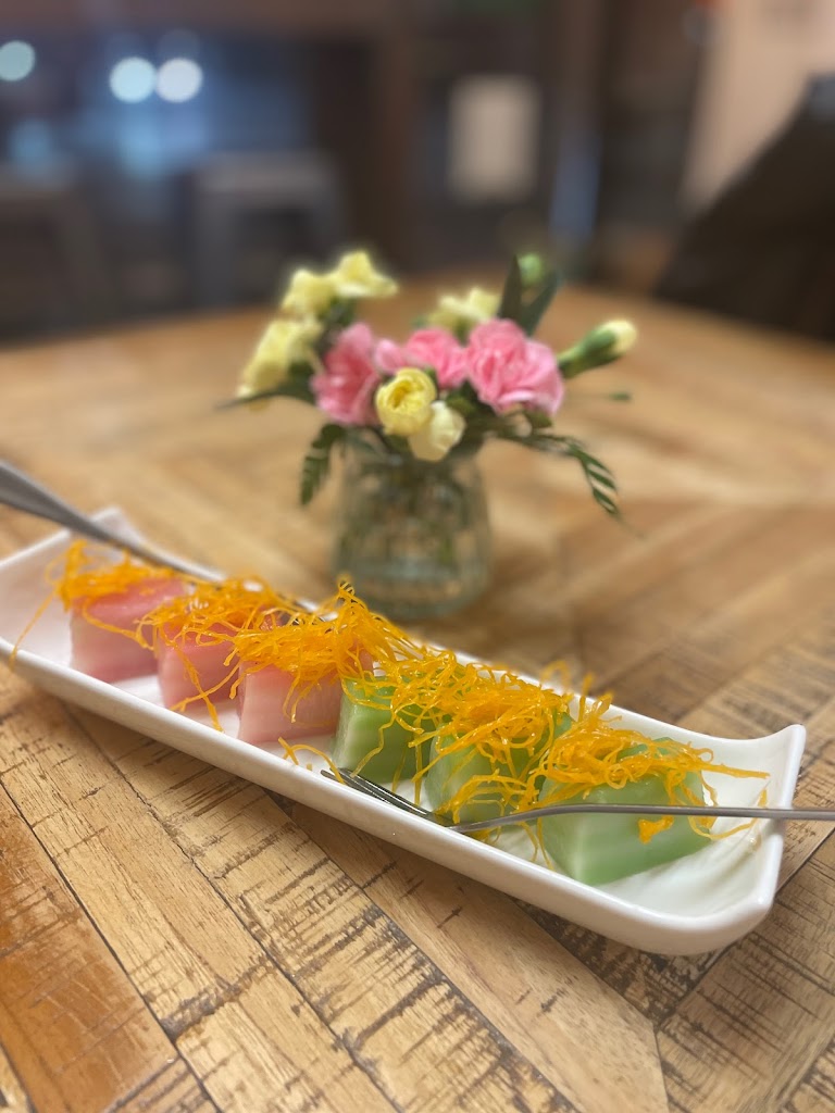 The Chicken Khao Soi - authentic, & packed with a lot of flavour. The chicken melted off the bone! The chicken wings were seasoned, and really crispy. The layered coconut dessert (cake) was delicious. Soft, a little chewy, and almost gelatinous (rice flour?). Perfect balance of sweetness and all the different flavour profiles. Everything tasted wholesome & like a home-cooked Thai meal. Great service too!