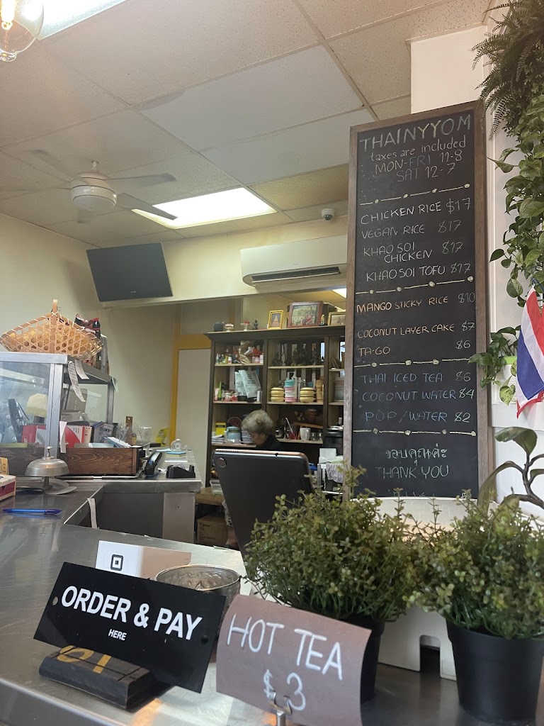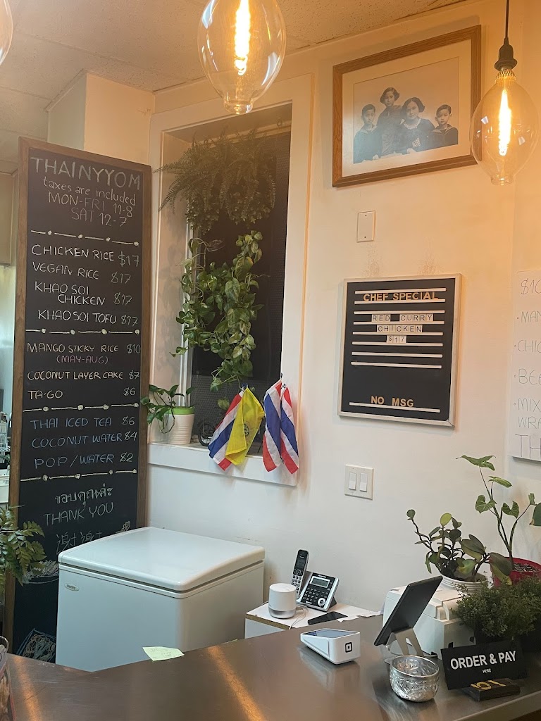 Hehe YUMMYY- it’s a Thai place (clearly) that I visited with my cousin. It’s a small cozy place, in front of the terrible intersection all drivers get honked at, but the inside is so nice 😋 they have a few goods they sell alongside the restaurant meals. The menu is small, and according to my cousin some things change daily. We got the fried chicken and rice and MUAH it’s so good. The chicken was crispy, the rice well seasoned, the sauce was so good (what is this secret sauce I must know), the soup was nice, and the Thai iced tea is GOOOOD. Please come visit, I’ll be back too! Thank you for having me!