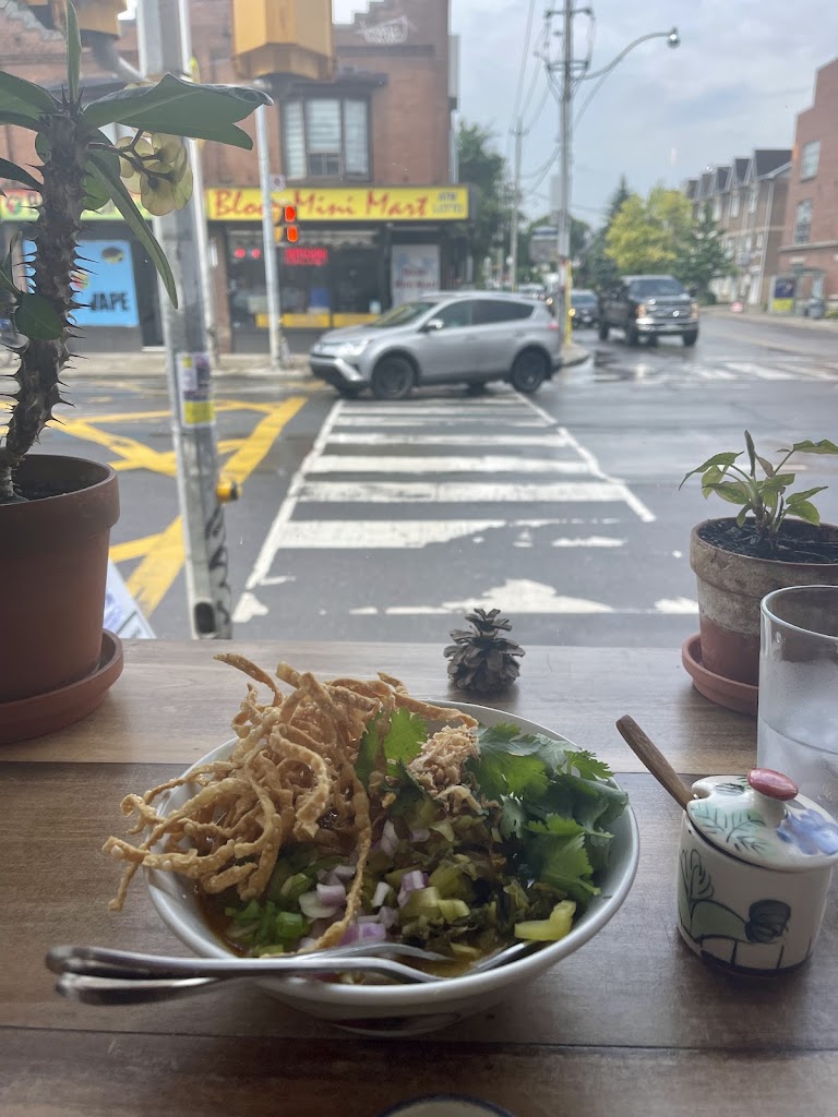 Cozy little Thai joint located near Bloor Station. Service is excellent - the workers are polite and ensure I have everything I need. I went here to try out the Khao Soi with chicken, and it was a delicious medley of flavours and textures in my mouth. There is great bar-style seating facing the windows, which is great for dining by yourself or with a partner/friend.