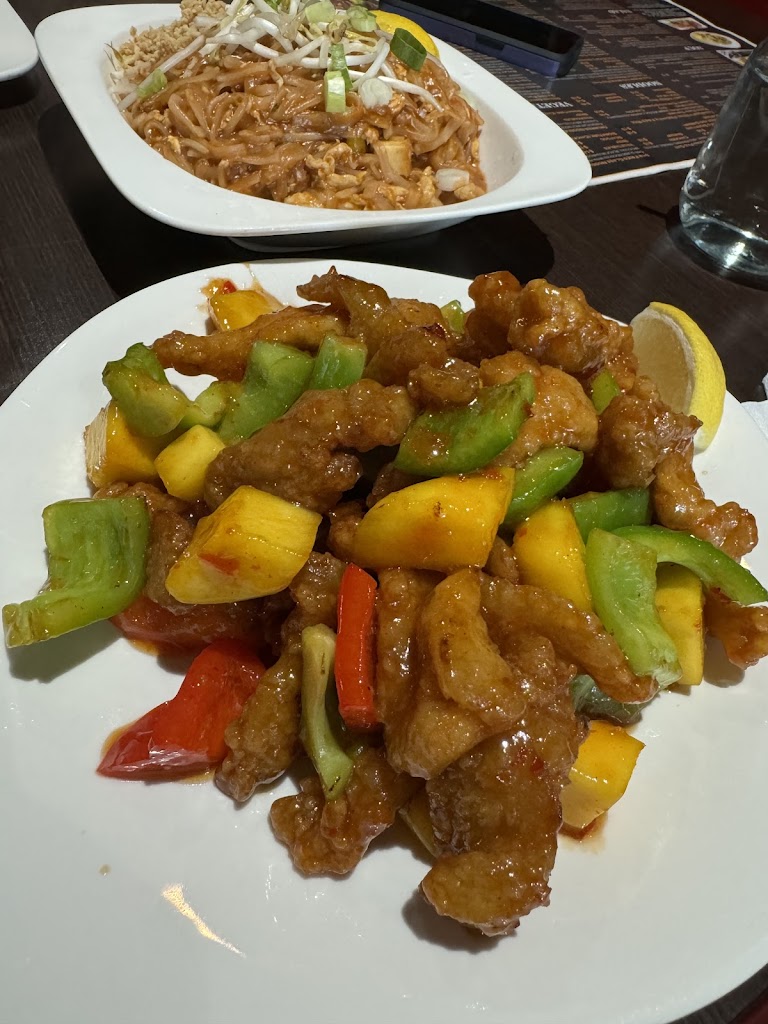 Location is convenient for us Walking distance from Main and Danforth. We had the Mango Chicken and the Signature Pad Thai with chicken and shrimp. There was a good number of shrimp in our order. Food was hot and freshly cooked. We ate at the restaurant, service was good and friendly.