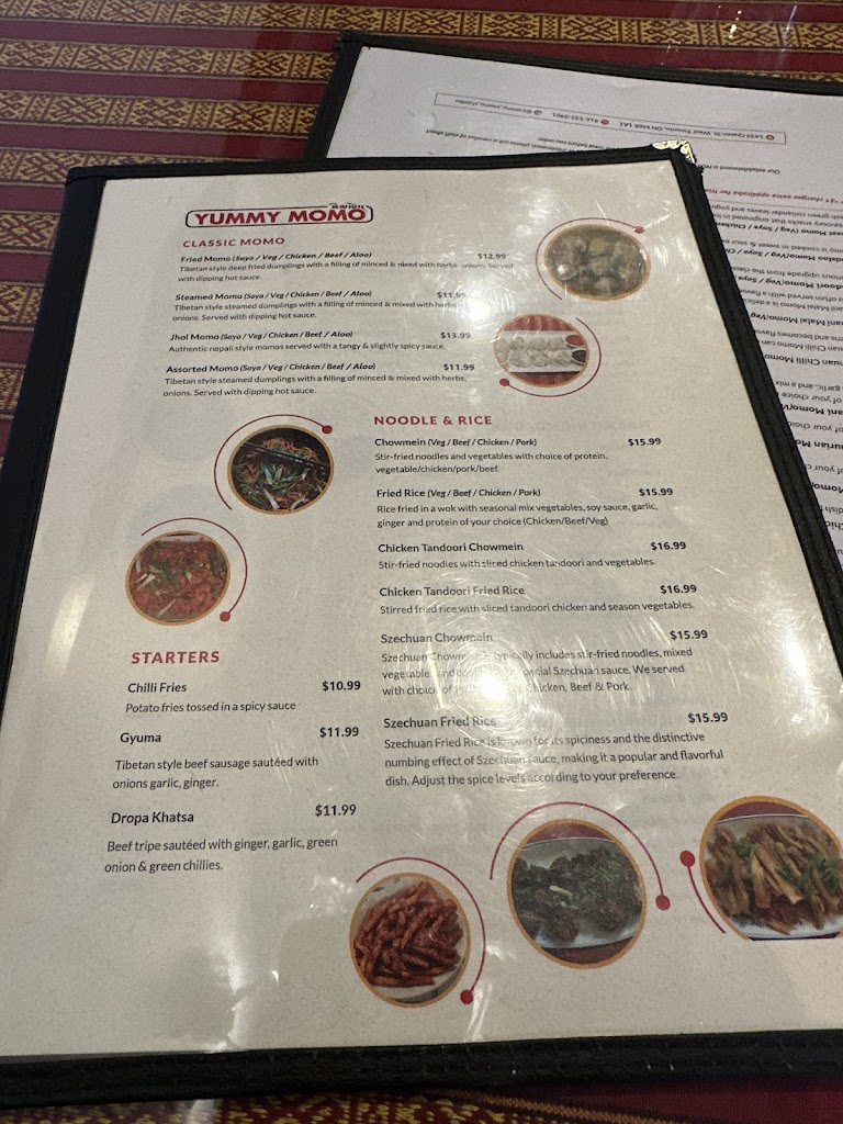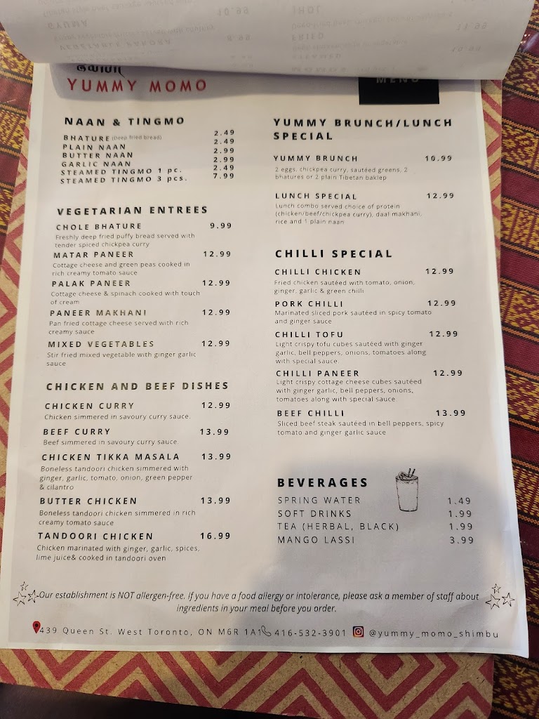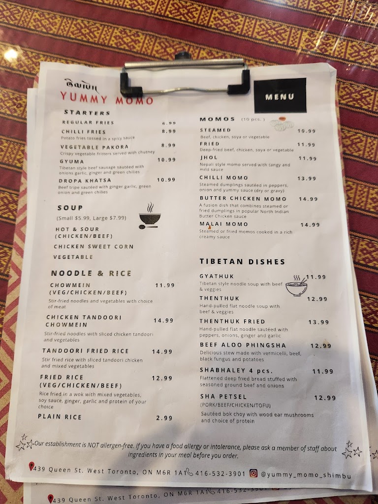 i lived in parkdale for a while, honestly theres so many wonderful tibetan places but today my day was made by yummy momo, it was clean, quiet, and had amazing filling food. the night was cold and after their gyathuk, i was warmed up instantly. our server was very polite and let us enjoy our meals comfortably, replacing our water when we needed, and taking our orders patiently. honestly one of the better restaurant experiences ive had and i will be coming back. please enjoy! Vegetarian options: almost the whole menu had veg options Parking: park down the street on a green p and walk around. parkdales lovely.