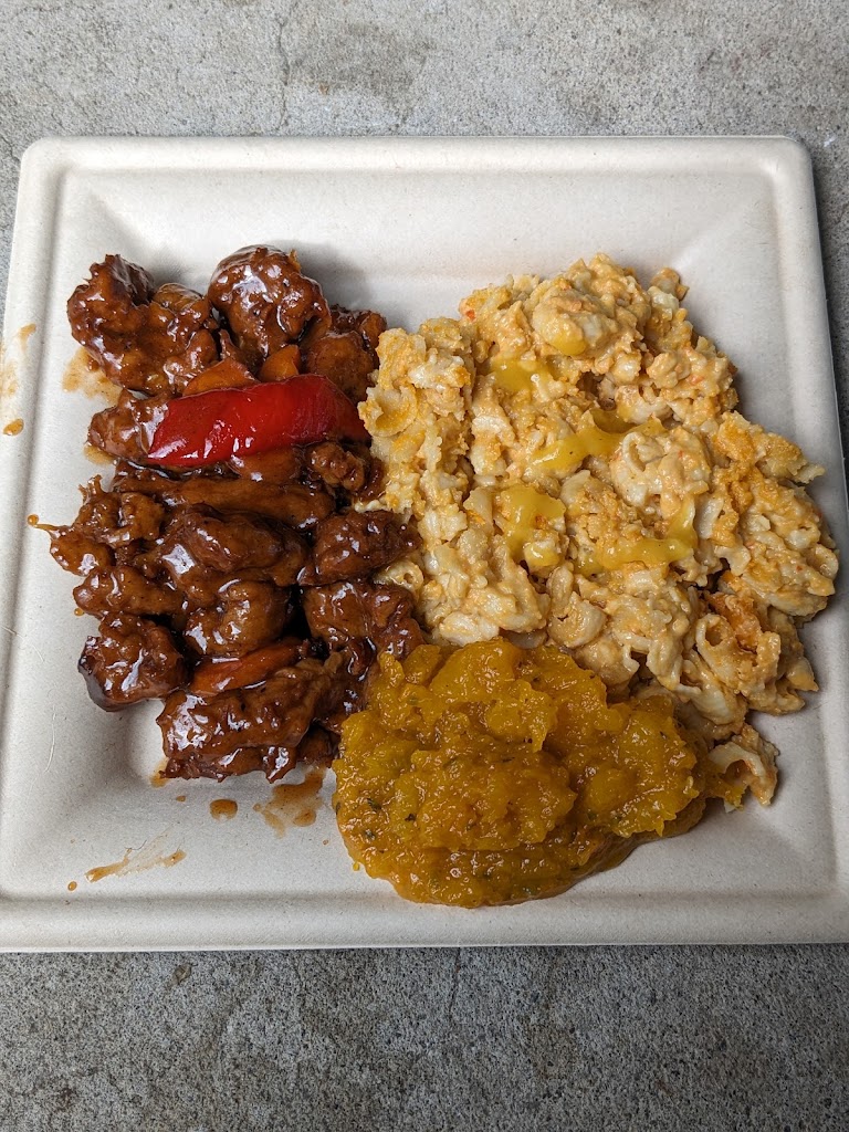 Great Mac and Cheez with BBQ soy. Catered to our school! Vegetarian options: All Vegan!!!! Food : 5/5 |