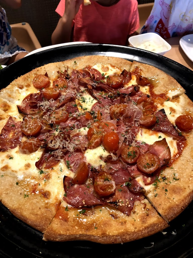 The pizza we had last night was very flavourful without being salty. I haven t been to BP in a long time and after this visit I will return to try some of their other pizzas. The staff were attentive and brought the kids crayons and an activity sheet to keep them busy. My only complaint, and a very minor complaint at that, is they need to do a better job at cleaning. The tables were very sticky and it s not a great feeling touching a sticky table and then using your hands to eat. That is the reason for 1 less star.