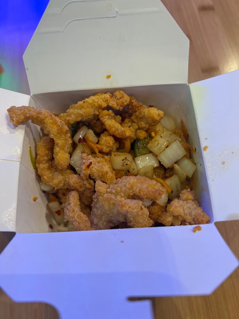 Got the salt and pepper chicken, it was a bit pricier than other things on the menu but it was really good. The food took a bit longer than expected to come out but it was well worth it. The chicken was crisp, the rice was cooked perfectly, the spice level was perfect, portion size was appropriate, and the veggies were delicious. I just wish there were more veggies in the box. The seating area is also very small, but seeing as the restaurant itself is quite tiny, there was only so much they could do.