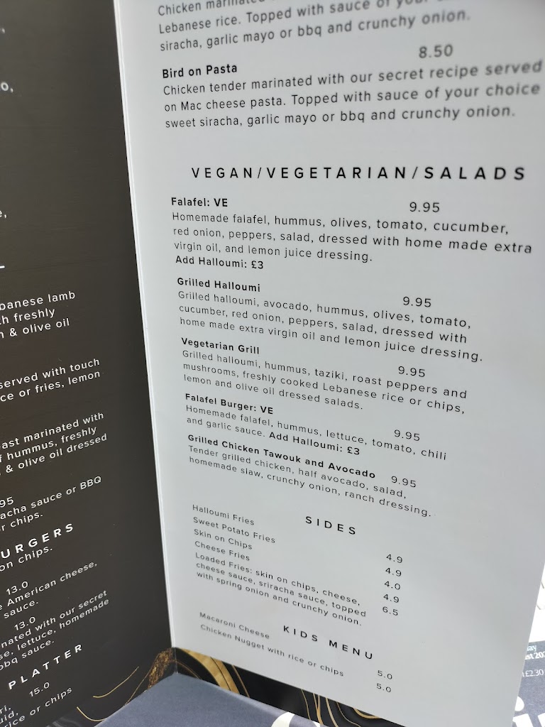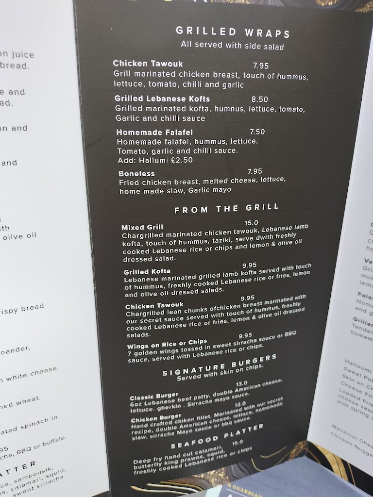 The food was lovely, even though it was mid afternoon on a Sunday with pretty rubbish weather. I had the lamb kofta burger which was excellent. My partner had the classic chicken burger, which was also very nice. They came with very nice fries plus I ordered a side of Lebanese rice. Everything was beautifully cooked and presented. We will definitely be back.