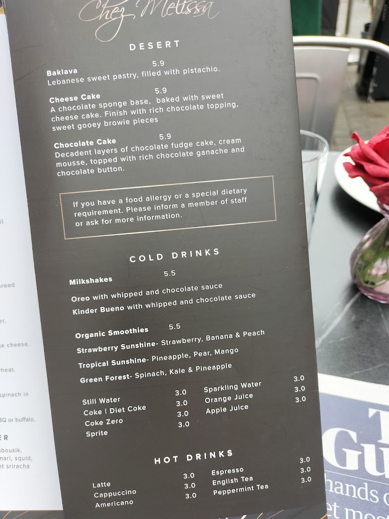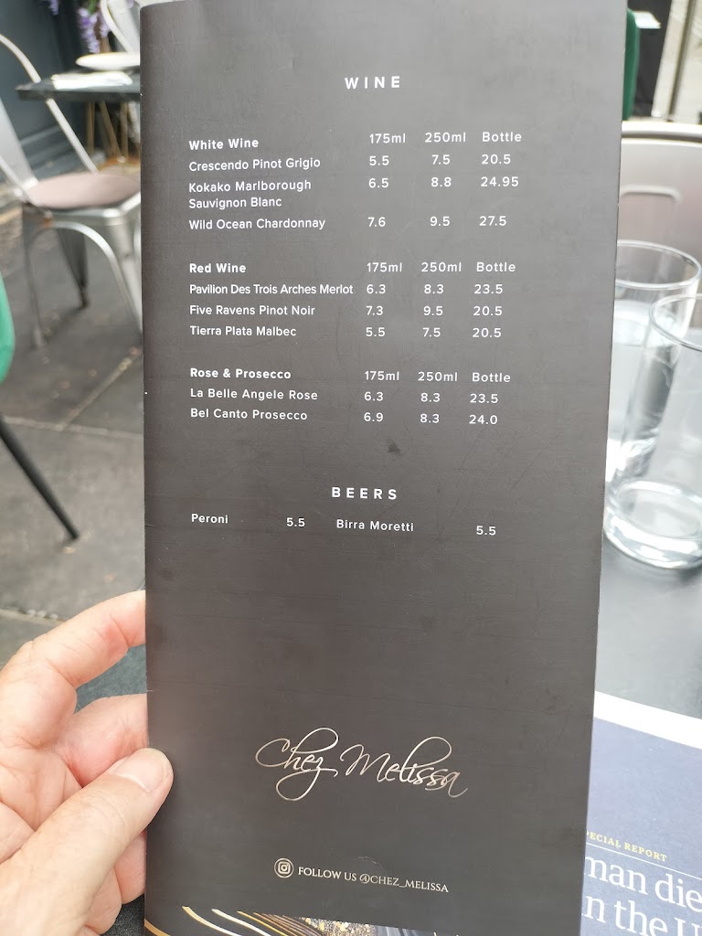 Went here for dinner last week with some friends, place is cosy but atmosphere is nice. The service was very good and the food was excellent. Staff couldn t do enough and were very attentive. The prices are very reasonable too, my friends and I highly recommend Chez Melissa, try it out. Vegetarian options: There a a few veggie options and they will modify certain dishes to help