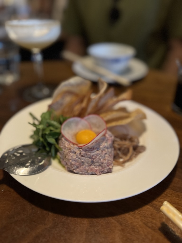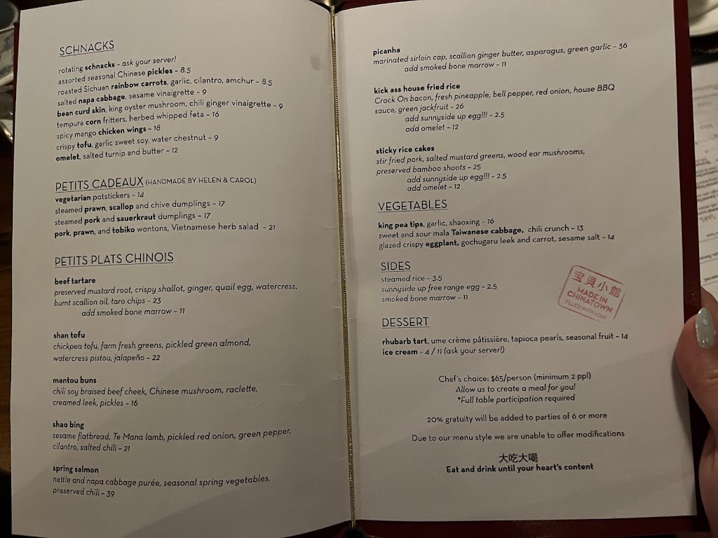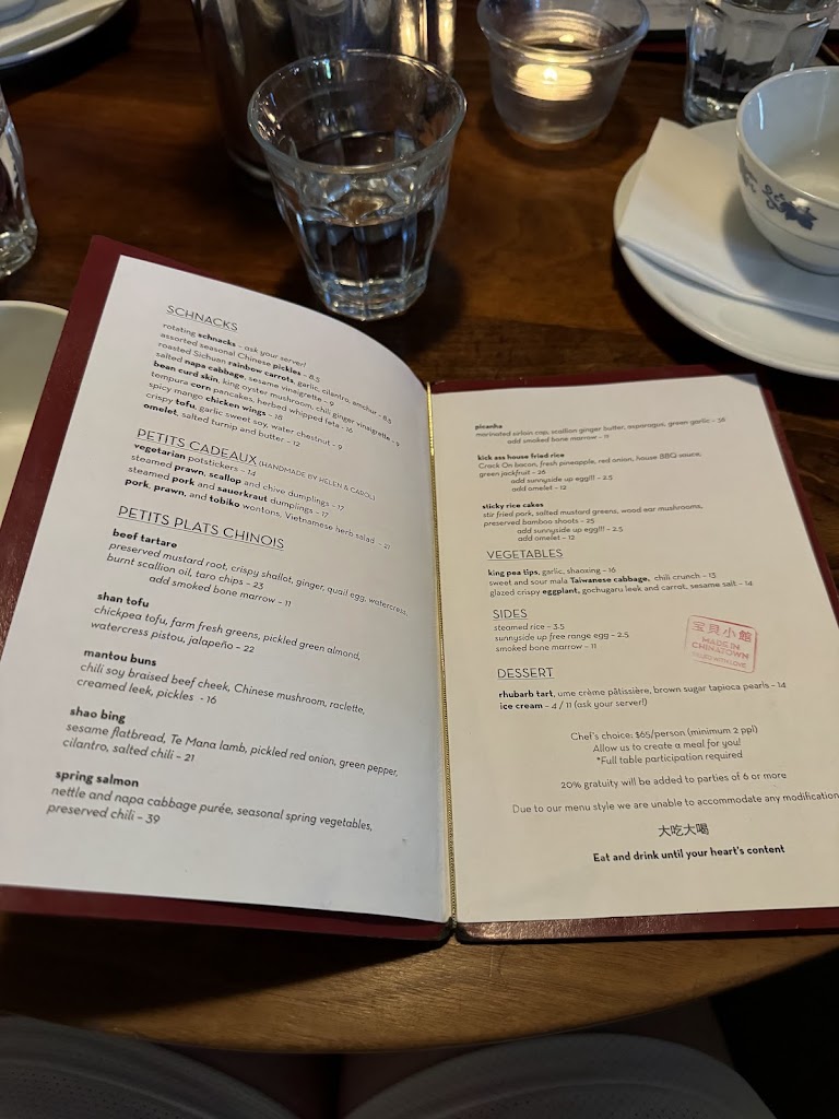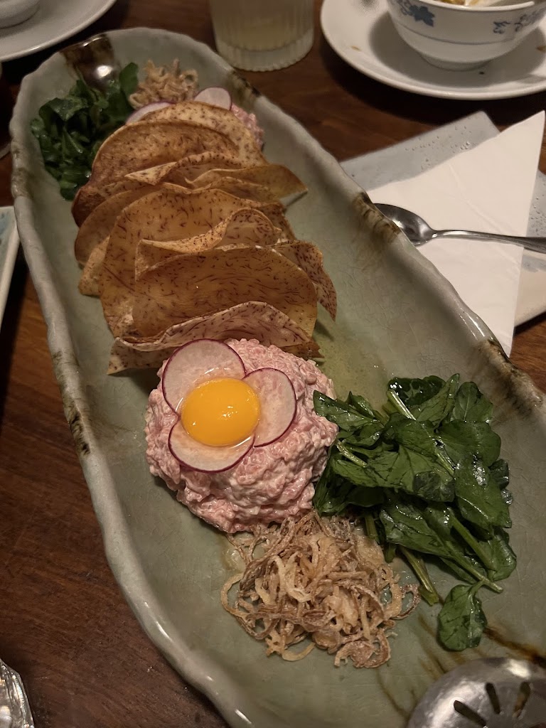 Food itself was OK / delicious depending on the dish. We tried the chefs choice option - which essentially allowed us to try most of the menu (11 different dishes) priced at $65 per person pretax. We were able to ask to ensure we get beef tartare as part of the menu - the restaurant was flexible to ensure we got to try what we want which is very nice. Lovely ambiance and seating, great service. Although the variety is nice, the chef’s choice option was too much food (we were a group of 5). Had we ordered all the menu options separately it would have been cheaper for us (although I’m sure the portion sizes may differ). A breakdown of the food items we got under the chef’s choice option (and the price on the menu if you order separately), recommended dishes will have a 🥟 emoji beside it: - Crispy tofu (value: $9) - Napa cabbage (value: $9) - Bean curd skin (value: $9) - Beef tartare w bone marrow (value: $34) - Wontons (value: $21) 🥟 - Mantou buns (value: $16) 🥟 - 2 types of Dumplings (value: $17 x 2) - Spring Salmon (value: $39) - King Pea Tips (value: $16) - Picanha steak (value: $36) 🥟 - Sticky rice cake (value: $25)