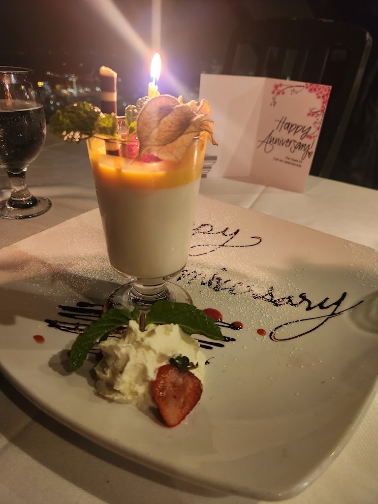 Visitors to Vancouver- plan ahead and make a reservation. This is the best option for seeing the city from a truly unique perspective. The food is well prepared and the desserts are beautiful and taste fantastic. Be sitting down when you first look at the prices but know that you are paying for the spectacular views and the food is a good value when considering where you are sitting to eat it. The service was impeccable and the staff are very helpful in pointing out the different landmarks etc as you rotate around the full city views over the course of an hour. We were not rushed at all to finish and did a full 2 and half times around while enjoying the views. Special events like Christmas , New Years and even the fireworks are an option as well but you definitely need to book well in advance. We were celebrating birthdays as this is the perfect spot for a special occasion for anyone living in Vancouver. Might try one of the event nights in the future as a good time was had by all. Thank you TOV for a memorable evening.
