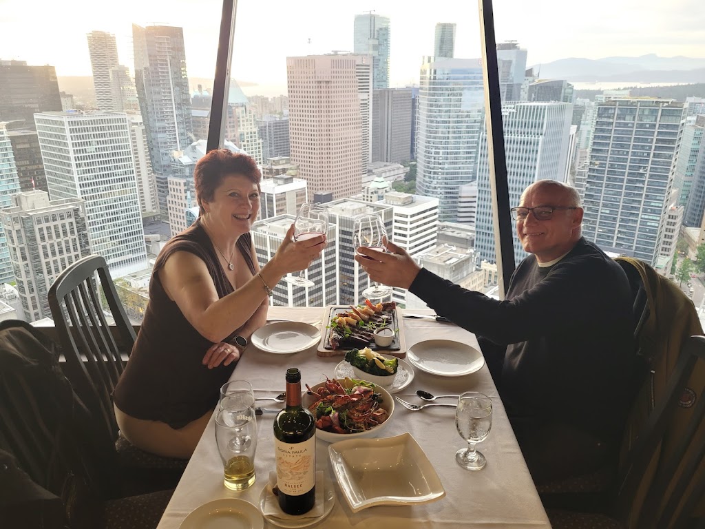 My wife and I celebrated our ten year wedding anniversary here. I made a reservation a few days in advance. We arrived at 3:15pm and stayed till 4:50. At 5pm is the Happy Hour crowd. The elevator ride from ground floor to the restaurant is quick. The view through the glass is beautiful. Once inside the restaurant we confirmed our reservation and were promptly seated at a table by the window. Once seated we took in the birds eye view of downtown, Stanley Park, the harbour, the port, the train yards and the Skyline that add personality and cinematic tone to our postcard city. I went with the seared Ahi Tuna and my wife ordered the New York Steak. Before our meals arrived we selected the Soup of the Day: Lobster Bisque. It wasnt bad but there is a background flavor of oyster that was a bit strong for my tastes. The tuna and the steak were cooked perfectly. Our server Julia was amazing. She was prompt, professional and informative when we asked about the meal selection. My wife was interested in the Wagu beef but Julia let us know that the Wagu comes raw which was very appreciated. Because it was our anniversary, the staff kindly gave us a beautiful card wishing us all the best. And we also received a delicious cream custard dessert with fruit care of the restaurant. The view is really spectacular. I dont much care for heights, but for my wife and our anniversary I placed my anxiety on pause and took in the view. There are signs below the window panes saying not to touch the glass. A word to the patrons. Please do not kiss the glass or smudge the windows with your finger prints. I noticed while enjoying my meal that someone had pressed their lips to the glass with lip gloss. It is off putting to see this especially when eating a meal. The view is stunning and on a clear day you can see for miles everything around you. Thank you Revolving Restaurant staff and management for making our tenth wedding anniversary memorable and delightful