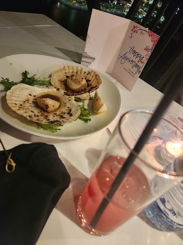 For my husbands birthday, I reserved a table at this restaurant, and I must say, it was the best decision ever. We went during sunset, and we enjoyed both the daytime and nighttime view of Vancouver while we were there. The food was absolutely exquisite, and we savored every bite of the delicious dishes and cocktails. Our server was exceptionally kind and even helped us choose dishes and cocktails that suited our tastes. In my opinion, everyone in Vancouver should try this restaurant at least once and indulge in the fantastic atmosphere and high-quality cuisine