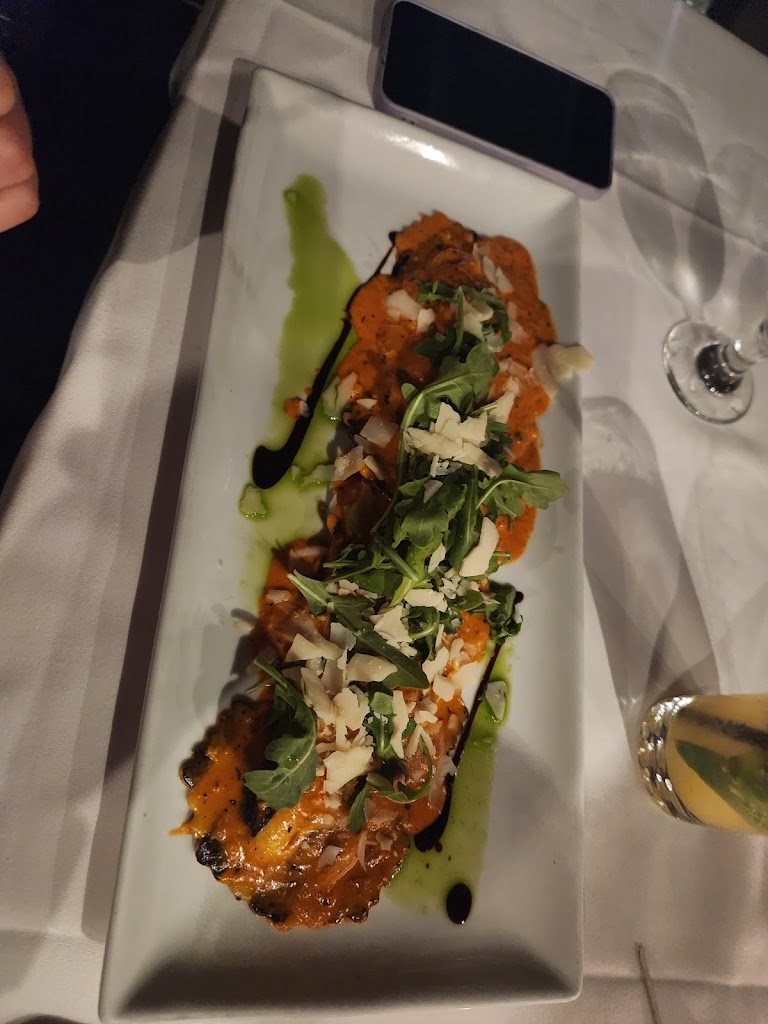 We had wagyu carpaccio and arancini for appetizers. Carpaccio was not that oily, plain but savory, juicy. The harmony with cheese made the food perfect. Arancini was so-so, well-cooked, but not that special. Arugula was so fresh, and I loved it. Salmon was dry. It was overcooked for sure. Shrimp was also dry, not fresh. It was a bit fishy, but lemon suppressed it. I LOVED the pasta. My boyfriend thought it was not worth the price. Because we expected the lobster would be on the pasta. But actually, it was in the ravioli, and I liked it. The combination with the sauce was amazing. The sauce was so great that I wanted to lick the plate. Im at a loss for words for the steak. We ordered medium-rare, but it was definitely medium or medium-well. There was so soft part inside the steak. And they insist its definitely medium-rare. So we got another one, but it was too fatty and too tough to chew. Also, the seasoning was just salty, and steak didnt taste any good savory beef taste. Service was okay. He checked us and served food one-by-one so we could have these in order. Overall, it was good because of the view.