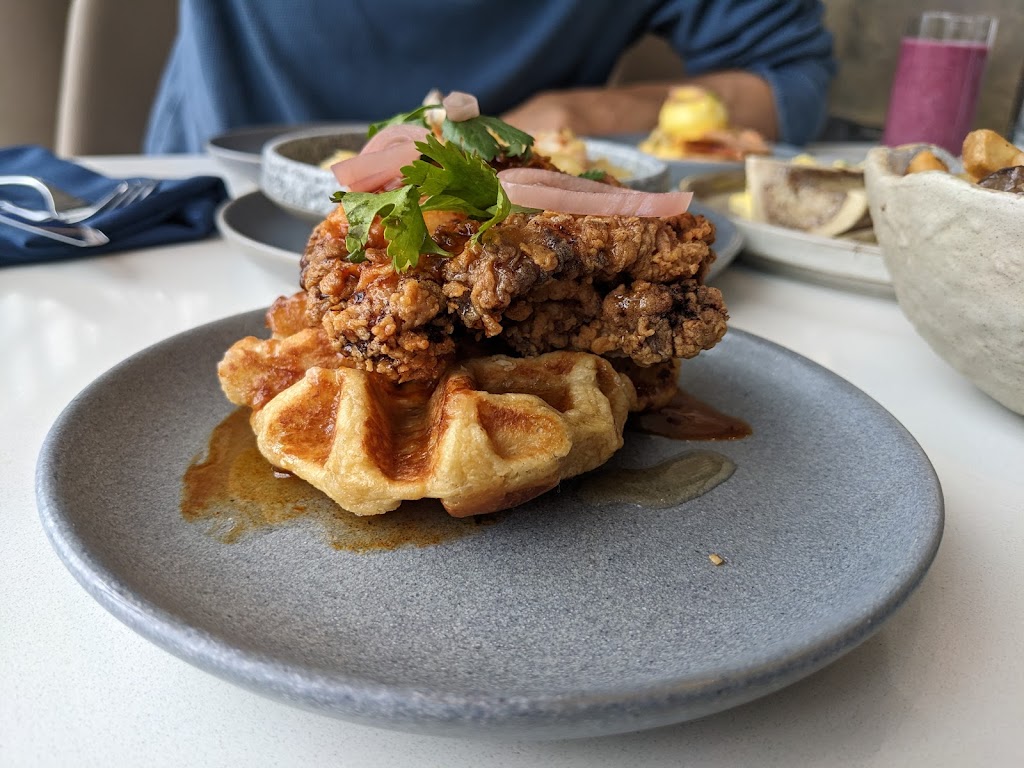 My friend took me here for the bottomless brunch for my birthday. We ordered 3 rounds of plates and we werent able to finish all of the food so they let us pack some up which was nice. The food selection was pretty good, there was quite a lot of items to choose from. We also ordered the flight of mimosas cause they looked so yummy and cute! My favorite menu items were the spicy buttermilk fried chicken and waffles, Dutch baby, bone marrow and pork benedict. The service was amazing and I loved the singer at the entrance!
