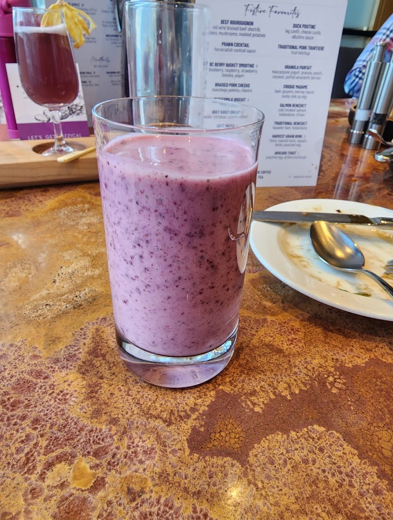 Dine Out brunch on this rainy day with friends. We parked nearby on Cordova Street which was $10/hour. Our brunch time was limited to 90 minutes. For $49 (regularly $65), you get unlimited coffee, tea, smoothies and a wide range of menu items. I would have liked to try everything but that would have been a waste of food. I settled with 3 items, which were all regular sized so I didnt have room for more. Food was good, but the fried chicken was overcooked. You can see Canada Place across the street. There was a musician playing guitar and singing, but it was not loud so the atmosphere was pleasant. The service was really good. Staff were always around filling up glasses, making sure you were happy with your meal, checking if you want anything else..... Overall, I really enjoyed this Dine Out.