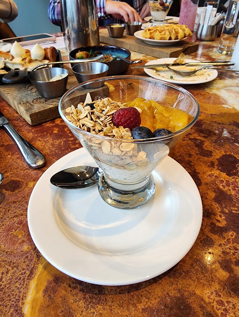 Heres the issue - brunch is outrageously priced with virtually no really healthy options (unless you order the bottomless brunch for $65 per person where you can get bircher muesli). $65 for a brunch (no matter if its bottomless) is far too much. The a la carte choices are all too much food and nothing is priced less than the high $20s - they are trying to convince you to choose the $65 option by offering poorly curated alternatives. No fruit salad; no yogurt; no granola. Just over-sized, over-priced meals. I will not return.