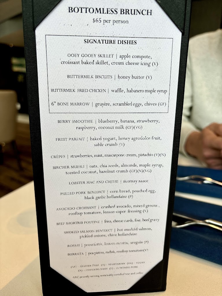 The weekend bottomless brunch is a must try. We went to celebrate our anniversary at ARC recently and went for the $65 per person brunch. Their dishes are served tapas style, smaller in size so you can try more of their menu. We tried all 15 items on the menu and could not finish it all. Everything was delicious, but the standout items for us were the fried chicken on waffle, the buttermilk biscuits with honey butter, and the ooey gooey skillet. Wonderful service, beautiful views, delicious food. Thank you for making our anniversary celebration so memorable. We will be back!
