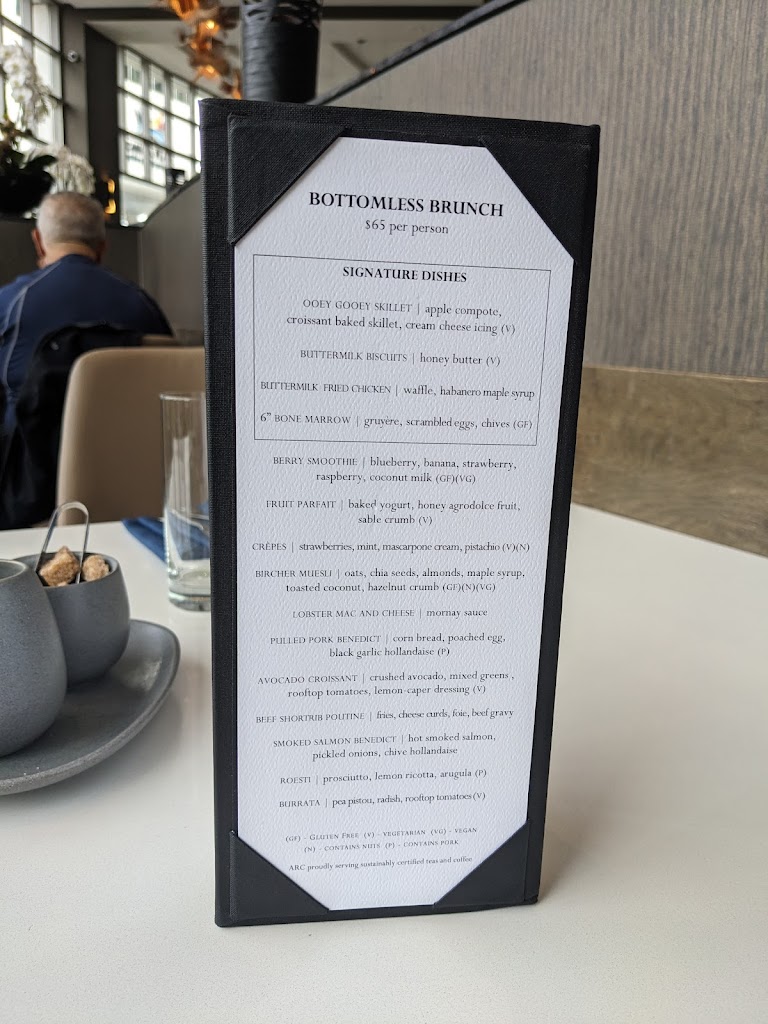 I visited ARC several years ago (brunch as well) and I knew I wanted to come back since its a nice experience, with pretty good food in a great environment. A quick rundown of the items I had: Ooey Gooey Skillet - So heavy, decadent, but good. It reminds me of a fresh Portos cheese roll, but even much more decadent. Roesti - Wife complained that salmon was way too oily and didnt eat it. Only dish we ended up not finishing. Its sitting on top of a hash brown that we first thought was just an English Muffin, that part was good. Dutch Baby - Not a sweet pancake. Its a savory housing basically a burrata and arugula salad. I enjoyed it. Braised Lamb Shakshuka Beef Shortrib Poutine - They of course have a poutine. Luckily its pretty good, not overly salty and fries were crisp when it arrived. Pork Benedict - Tasty flavor from the pork, not overly salty. Bone Marrow - I never get the allure of eating bone marrow, but the wife liked it enough to get it twice. You can ask for no bread if you dont want it. Spicy Buttermilk Fried Chicken - Really good. Better than Ive had at other places, but could not really taste the spicy flavor. Great balance of sweet & savory though. Mimosa Tasting Flight - Nice to look at and take photos. I imagine many girls order it. Flavors all sound appealing, but I really just tasted the champagne mostly. Blackberry Mule - It was alright. Would be better if there were some more fresh muddled blackberries inside to add more overall flavor. ARC is located within The Fairmont (nicer hotel) and the decor of the place is fitting. Nice, spacious interior, better than Ive seen in higher-end restaurants. We sat right by where we could see the rain outside downtown, city tourist vibes. It was a cold January but the heaters along the front of the windows more than warm the place up. In fact, since the window seats are right by the heaters I actually got to hot even after taking my jacket off. The server was very nice (is too nice a thing!? lol) She was attentive and we never felt like she was not there when trying to order more food. I know some people (the more anxious type) who might be bothered by this almost overzealous type of service. But Id much rather have it than have no or bad service, and than they still want a 20%+ tip for.... There is a parking structure (several) serving the area but since you are downtown, be prepared to pay a premium. This was the most I paid for parking my entire Vancouver trip, I think it was $5/half hour. Compared to that I remember thinking how cheap parking was in general at all other places. While I very much enjoy the AYCE brunch at ARC and none of the food Ive had there has been bad there are a few things they could improve on. I did find some of the portions too big, such as the Spicy Buttermilk Fried Chicken. If you are like me you are going to order many dishes at once, but along with that things get cold quickly as you are eating. I wanted to get another of the chicken, and I would have if the portion was smaller, but I was full and did not want to waste food. It might throw the kitchen logistics off, but something like half-portion options would be great and elevate my experience here. It seemed like almost everything came with a poached egg which I know is a brunch staple but some other variations would be appreciated. The drinks were not my favorite overall, but they did look nice. Im guessing they cant control it, but some type of parking validation would be great especially since its not the cheapest meal. If you are looking for a great (AYCE) brunch option with variety you should check out ARC. Cheers!