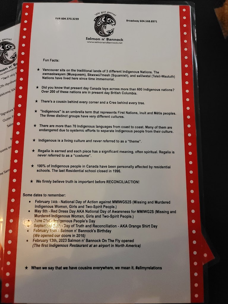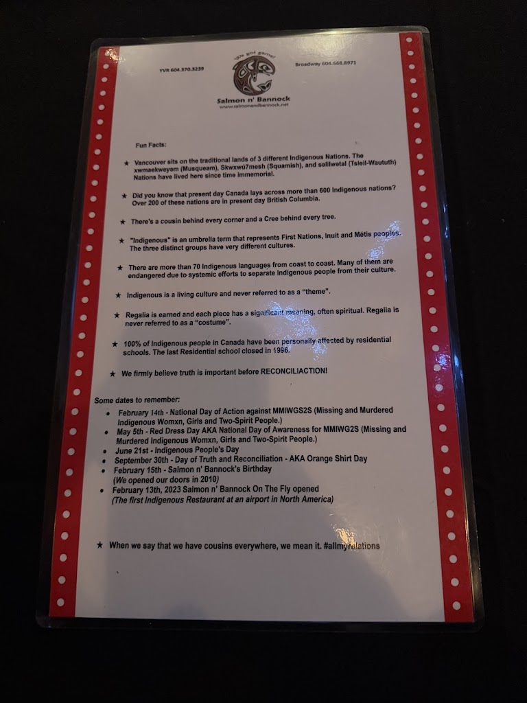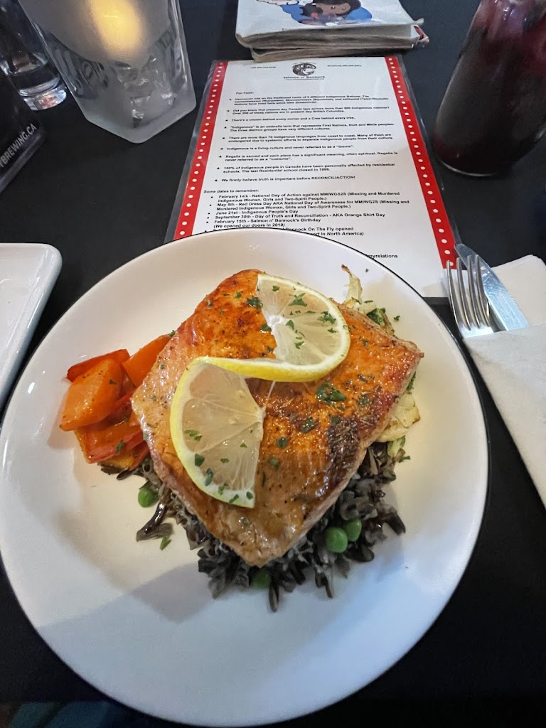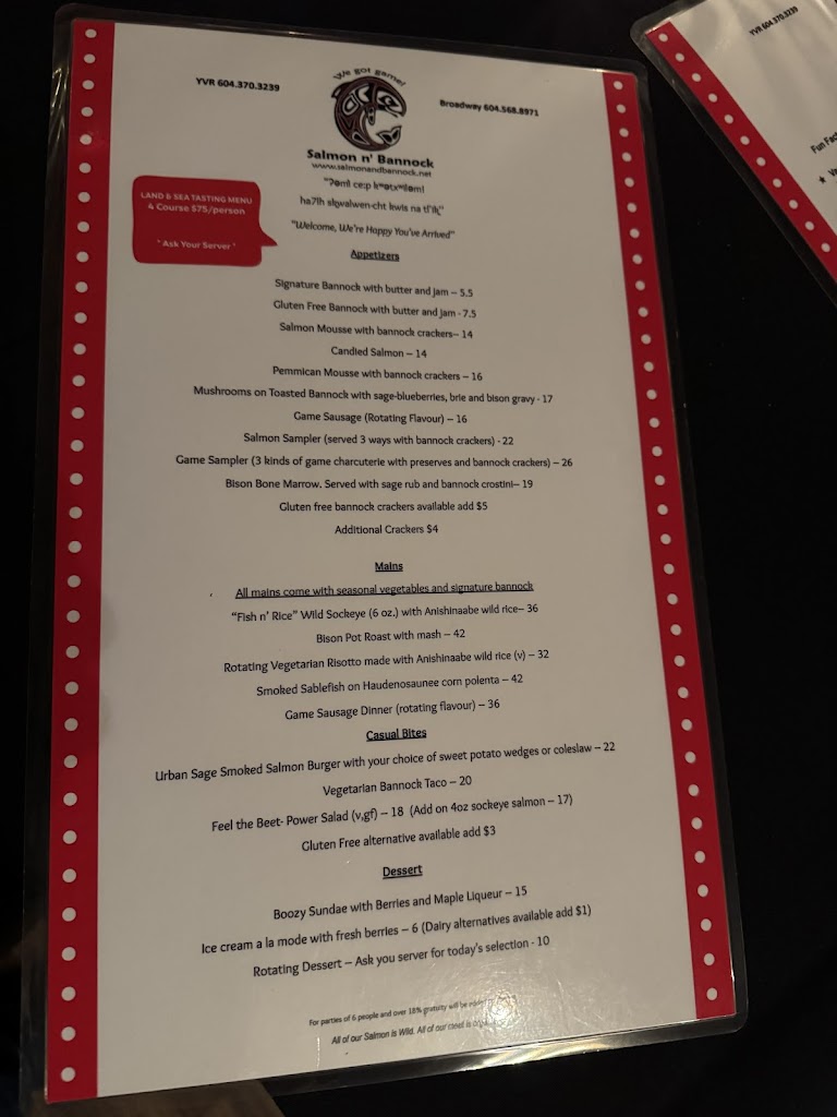 I was visiting Vancouver from Germany and wanted to acknowledge the local indigenous culture and history. So having lunch at Salmon 'n Bannock was an obvious choice to me. I had the sockeye salmon on wild rice and some beautiful veggies, and the bannock bread with butter. This was so delicious. The atmosphere was warm and welcoming. It was not too busy, the waiters were very kind and took some time to introduce the menu to me. While I was waiting for the food, I was given the "Sixties Scoop" picture book by the owner, Inez Cook. Overall, the experience was worth the money. I‘d definitely revisit should I return to Vancouver.