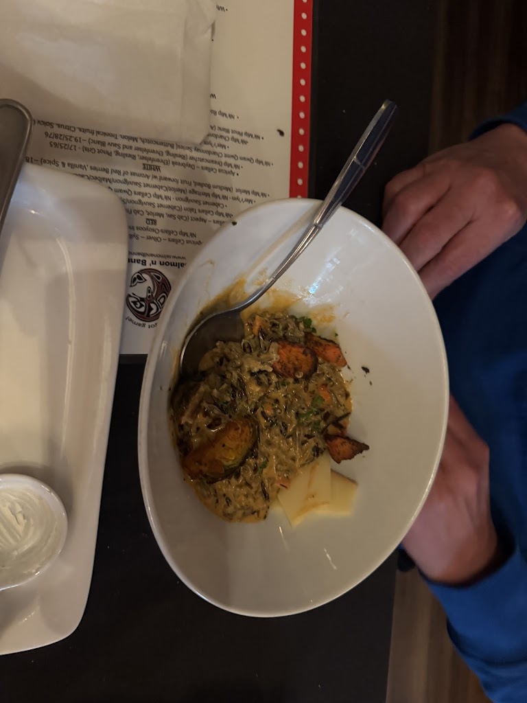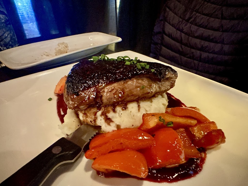 I had the elk steak (medium rare) on a bed of mashed potatoes with squash & cauliflower on the side (came with a cheese sauce in a small pitcher but did not add it). The elk was hands down the best steak I have ever eaten. Everything paired wonderfully with eachother as well as individually. Such an amazing meal, without question best I had on this entire trip. Cannot recommend highly enough.