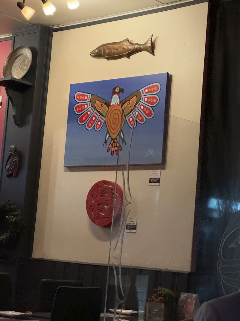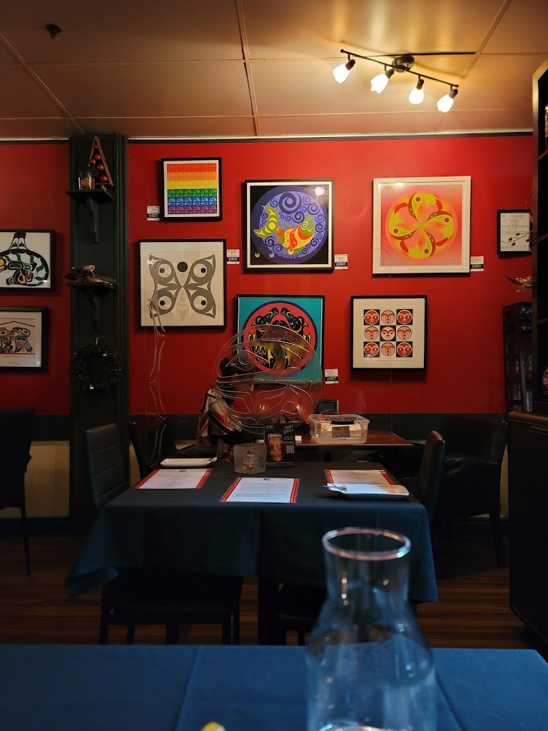 We had dinner here for the Dine Out Festival. The food was delicious and filling. The service was friendly. The restaurant was well decorated with a variety of artwork by Indigenous artists. We ordered the bison hunters pie and west coast wild fish stew for the appetizers, the elk medallion and smoked sockeye for the entrées, and we received the apple caramel cobbler for dessert. Our meal also came with bannock and butter, which was a plus. The server gave a land acknowledgement before the dinner, which is important and always good to see.