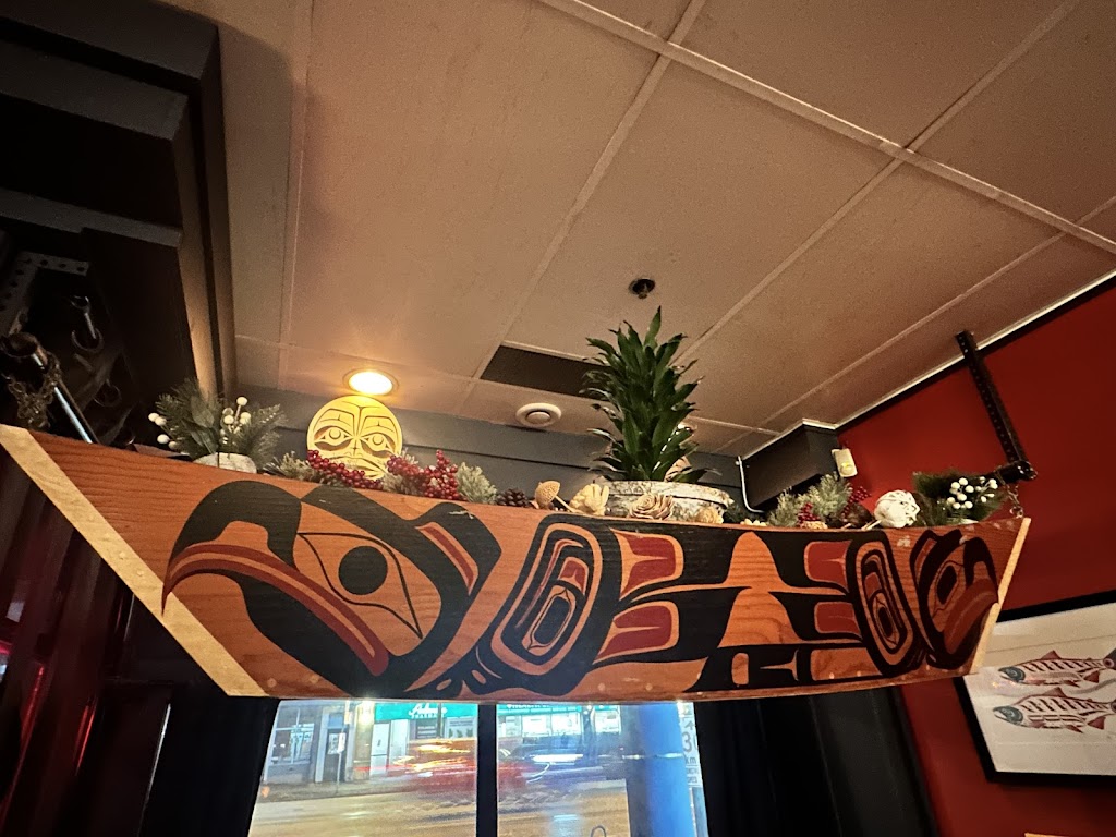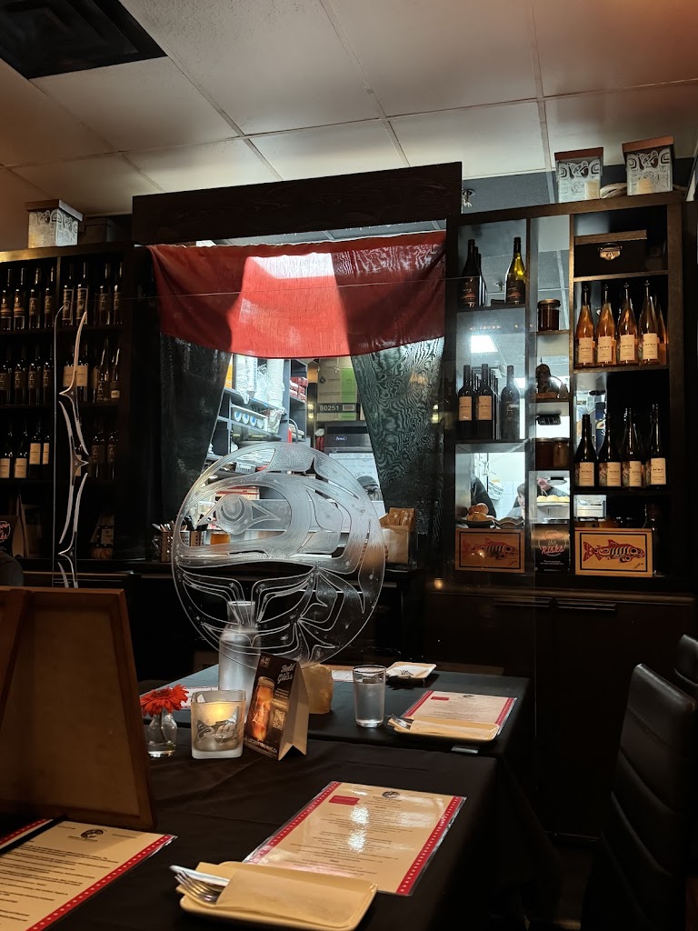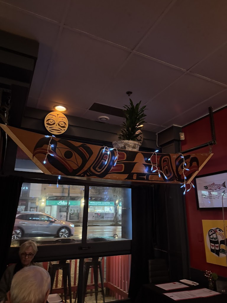 We were curious to experience this west coast restaurant and it turned out to be a feast for the senses from the warm welcome, the smells of cedar, the sound of indigenous music, the decorative touches, to the flavours of the food and drink. The menu was proudly described to us which helped us make our selections and this enhanced our dining experience. We were invited to take our leftover bannock home. Extra points for reducing food waste. The service was wonderful. Reservations recommended as the restaurant has limited seating. Several groups of walk-ins were turned away while we were there. There s paid parking at the back but it s difficult to access the restaurant from the upper lot if you have mobility issues as the elevator is not in service. If you drive around to the lower lot there are stairs.