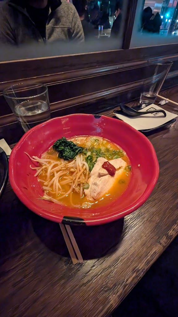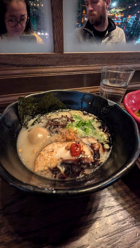 Fairly yummy ramen! Service was excellent and very quick. The bar area is super cute! The only reason I didn't give a 5 for food is because I'm from Toronto and Ottawa and have had either comparable ramen or better broth for slightly less $ so I don't know if I felt the value quite equalled the cost. Definitely a personal bias though! We had the tonkotsu black and spicy chicken ramen. The chicken ramen was better of the two!