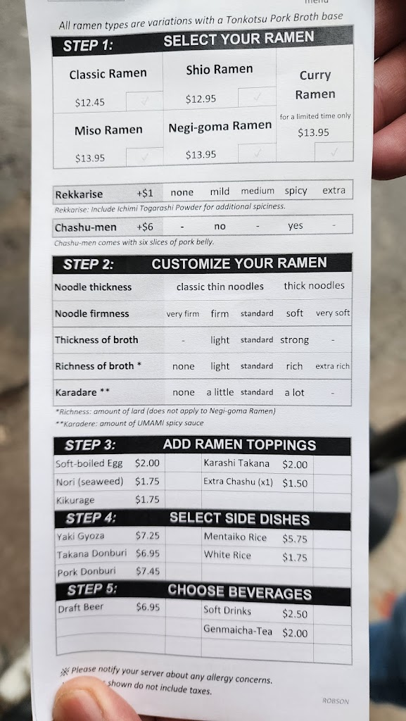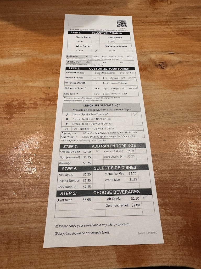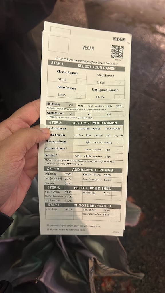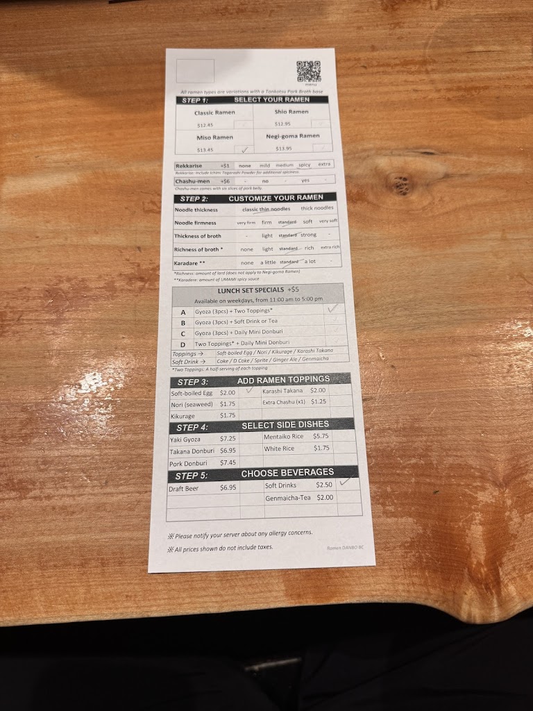 Im surprised by them charging each topping for a ramen.... First of all, we had to wait outside a bit for a seat, which is normal for a ramen shop in dt. Servers were very friendly greeting up with a menu ordering sheet, which gives some instructions on how to order food there. The sheet listed out some ramen items with no descriptions, like you cant tell whats in a certain ramen. Then we see there is a section showing some topping options for extra charge...we suspect there would be enough toppings on a bowl of ramen that we need any extra topping? But there was no servers to explain these of course. Not to mention this ordering sheet is very badly design, there are some not very common Japanese words with no English translation, we dont know kikurage or karashi Takara without going on Google translation. Of course there was no servers to explain to us since we are just customers waiting outside. This menu makes extremely inconvenient and confusing to read... When we finally got our seats, the servers took the order sheets and went straight to order...though I thought from my experiences of eating ramen these years, a shio ramen would go wrong, and normally a standard one comes with enough toppings for my appetite, so I didnt bother with adding any extra toppings. Surprisingly, the ramen came, with only two pieces of chasu and some onion...and the broth is extemely salty, not a fan of the noodle texture either. But I have to applause their chasu was done perfectly, in both the texture and flavors. Overall, not a fan of them charging for every topping, but I guess its way to show even more extension on customization. However, a suggestion for the restaurant: the menu sheet needs to show more clarification and inclusions (I dont think everyone understands every Japanese words here in Vancouver) Vegetarian options: They have a separate ordering sheet for vegetarians.