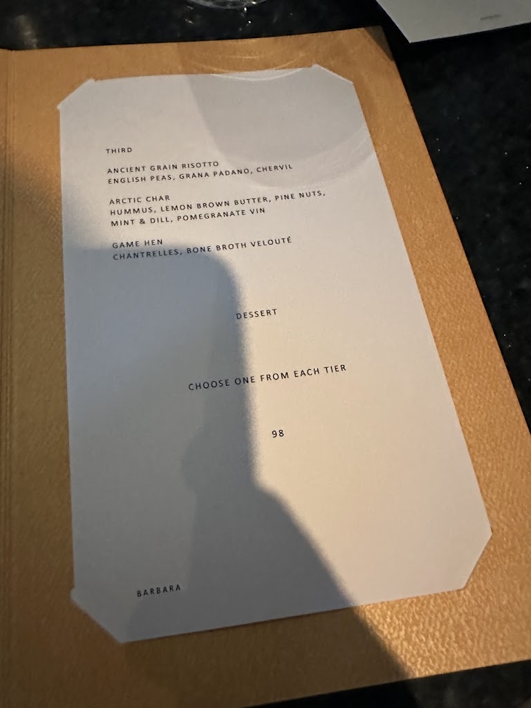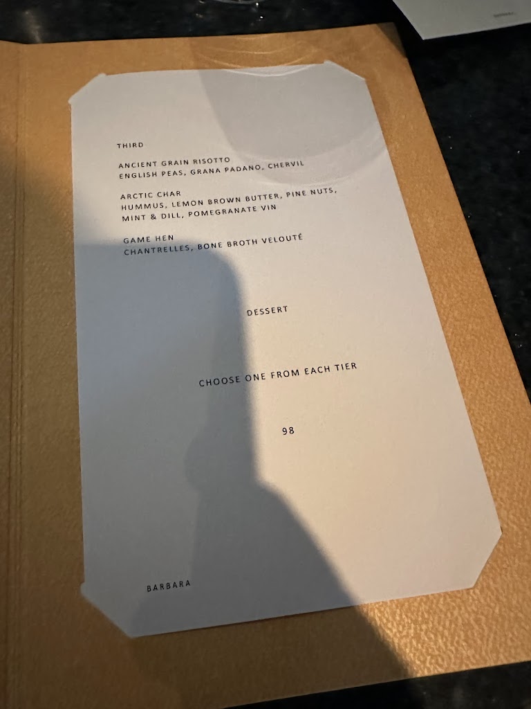 We overall enjoyed our visit to Barbara, the food presentation was fantastic, service was amazing and on point, however we were left feeling like we wanted a bit more once we were done our meal- the portions are quite small, and we offered to pay more to get some items a la carte that we could eat but it turns out we had already tried everything in our tasting menu. The food itself didnt feel like it had a type of cuisine, it was a mix of middle eastern and east coast American along with some items I wasnt sure.