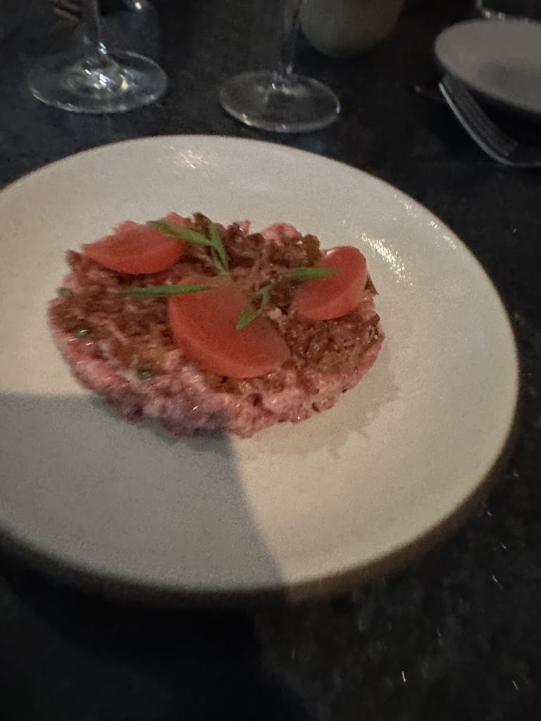 Our friends raved about this place so my partner made a reservation for our anniversary. I found that our experience did not resonate with theirs. There are three courses, we each got different dishes from each course to share. Out of each course I would like one but dislike the other. When it s good it s really good. The beef tartare is delicious.