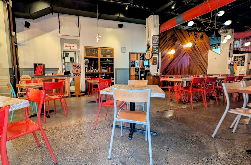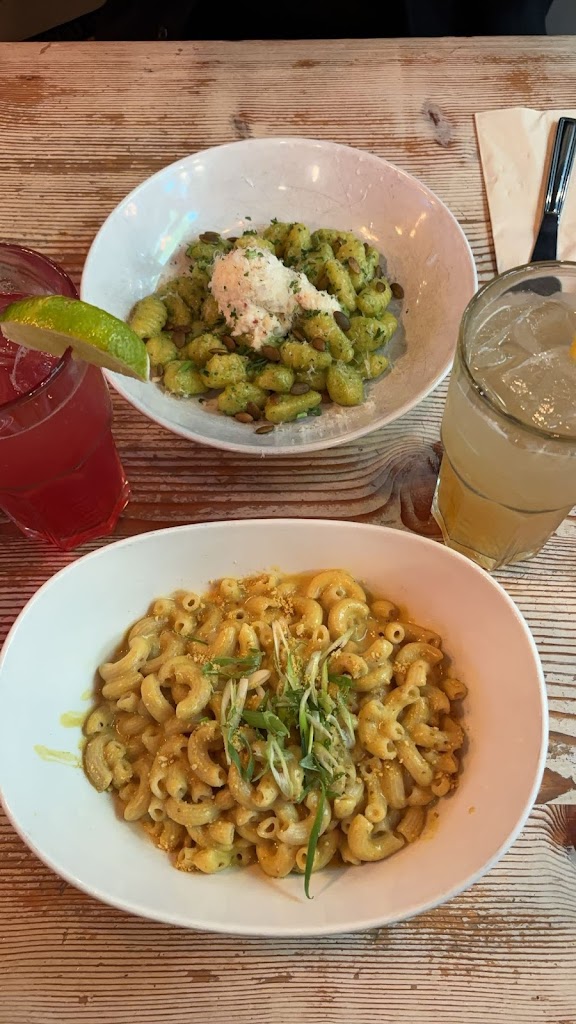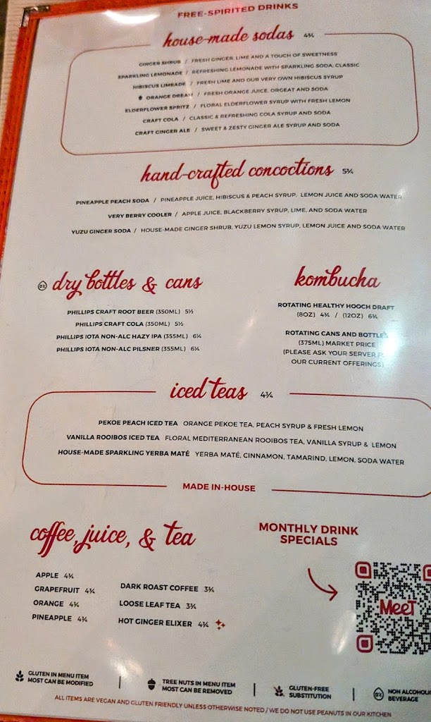 Good vegan eats! Pea protein instead of wheat, some soy. Service is either great or horrible. Nice room, lots of options. Rotating daily specials. Delicious ginger shrub and creative drinks. I love their rotating soup options and daily feature drink! Delicious desserts but can t go wrong with anything here! Nice natural light patio! Because of covid the menu has changed but still delicious! The steamed kale with miso and Caesar salad I hope the hot chiggin comes back! Good music guys! And last call is 15 minutes to closing not an hour which is really nice!
