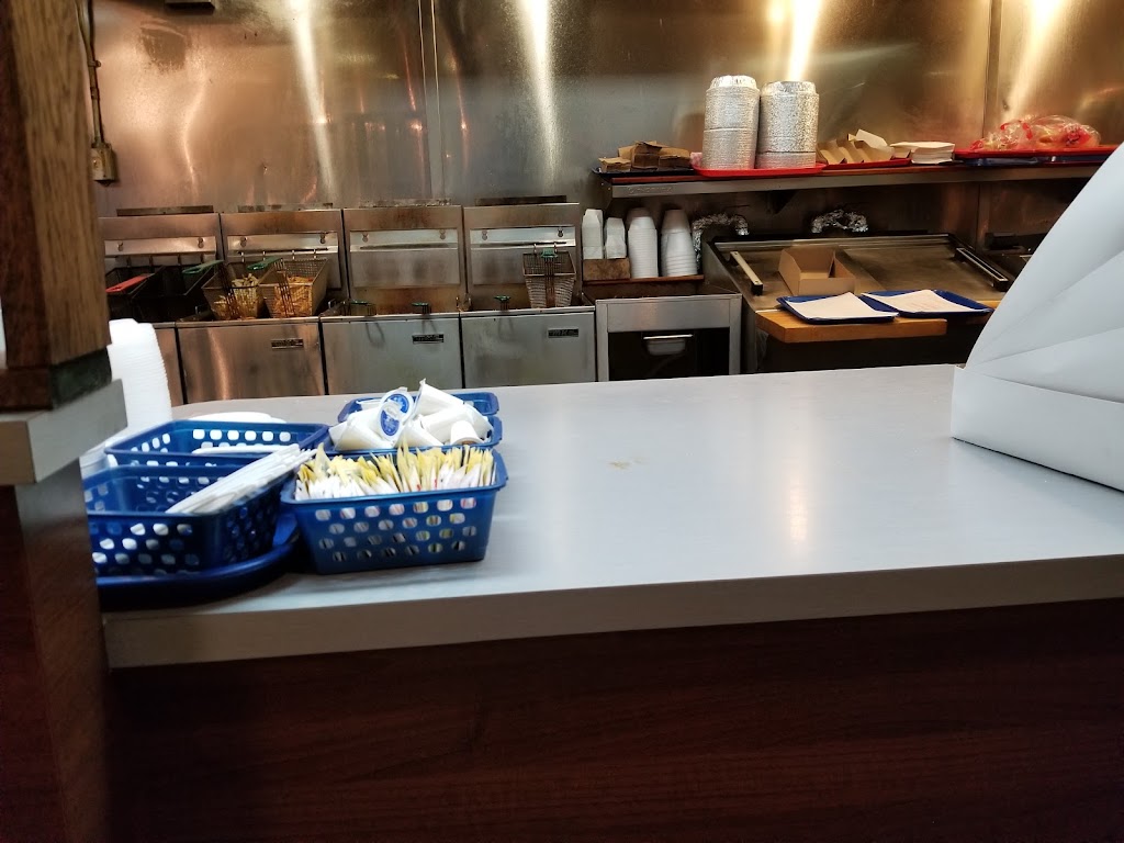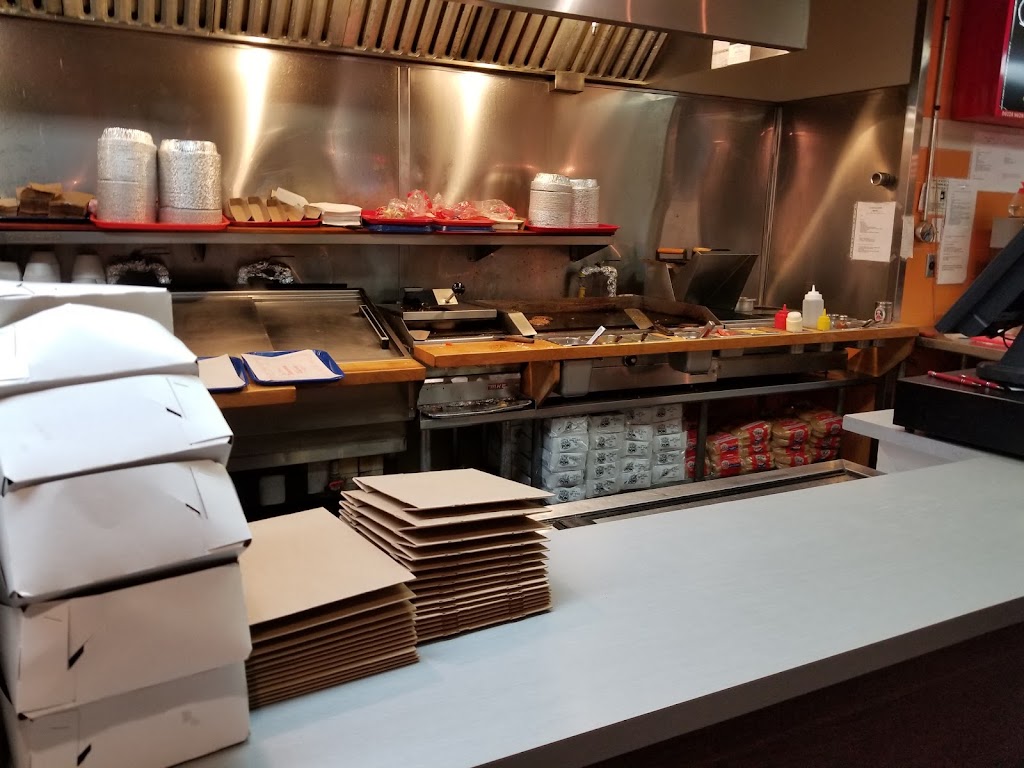 Tables were absolutely filthy..sticky. Ladies Bathroom disgusting. Not sure if Ill go back given lack of cleanliness. Giving only one star because of these aspects. Perhaps lack of staff, who knows. I am updating this because I should have mentioned that the - food was great, cheesburgers, fries. Staff at counter super friendly and efficient. But next time if I go, Ill take the Food to go.