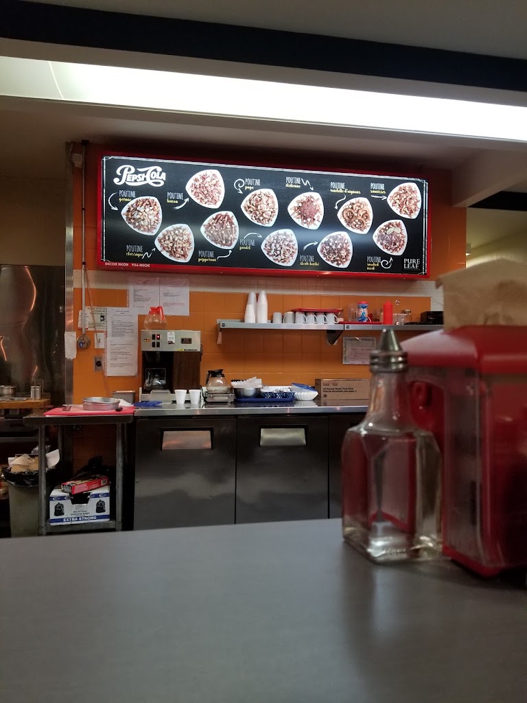I've lost count of the amount of times I've been to this place. I tend to always buy a medium poutine with 3 hot dogs. The food is very comparable to places like "la belle province". As for their poutine, you can get yourself a nice fresh medium size poutine (see picture below) for around 8$ if I remember correctly. The fries are always made fresh since you can see them make the food in front of you. Theres a generous amount of sauce and cheese. As for the hot dogs, they are good as well, though Id be worried if a business messed up steamed hotdogs. Ingredients are fresh (onions and stuff). I can normally get myself the medium poutine and 3 hotdogs for 14 bucks, so very good prices. The inside always seems to be clean, I've never personally eaten in the restaurant but it always looks clean. The place looks modern and has plenty of seating. I haven't personally tried the burger but when my brother did he informed me that it tasted good. There are plenty of other food options and I encourage anyone reading this to give the place a try.