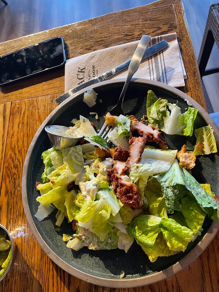 Very long having food, only 6 customers in the establishment. Caesar salad lacks dressing and overcooked chicken. Smoke meat too dry. Inadequate quantity versus price.