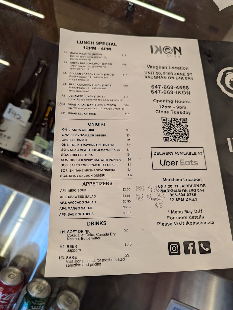 IKON Sushi is one of the better sushi takeouts in Vaughan. Ive enjoyed every order I had here and it never disappoints. My go to option whenever I crave sushi