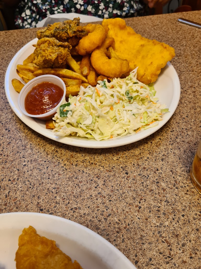 Good variety of fish. Nicely cooked. Great fresh coleslaw. Not overdressed and soggy. Clean with super service.