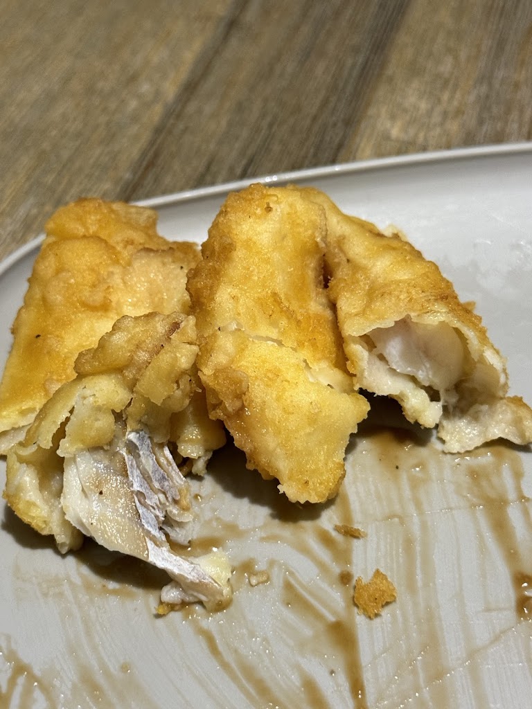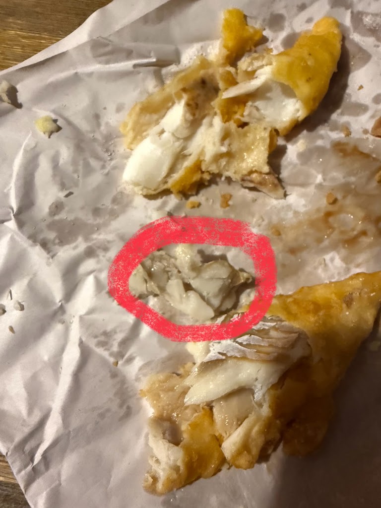 We ordered Family special from the takeout menu and it’s the first time the food was horrible. Some of the fish wasn’t cooked fully and 1 piece wasn’t cooked Ben chewable (circled) We normally love the tartar sauce but this time it just tasted like mayonnaise. So disappointed. We ordered an extra lg fries and it was all in one wrapped paper and wasn’t enough to go around for the first time. Normally we would recommend the food but sadly not this time.