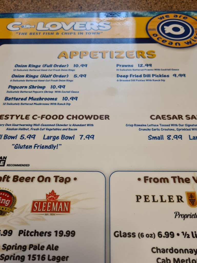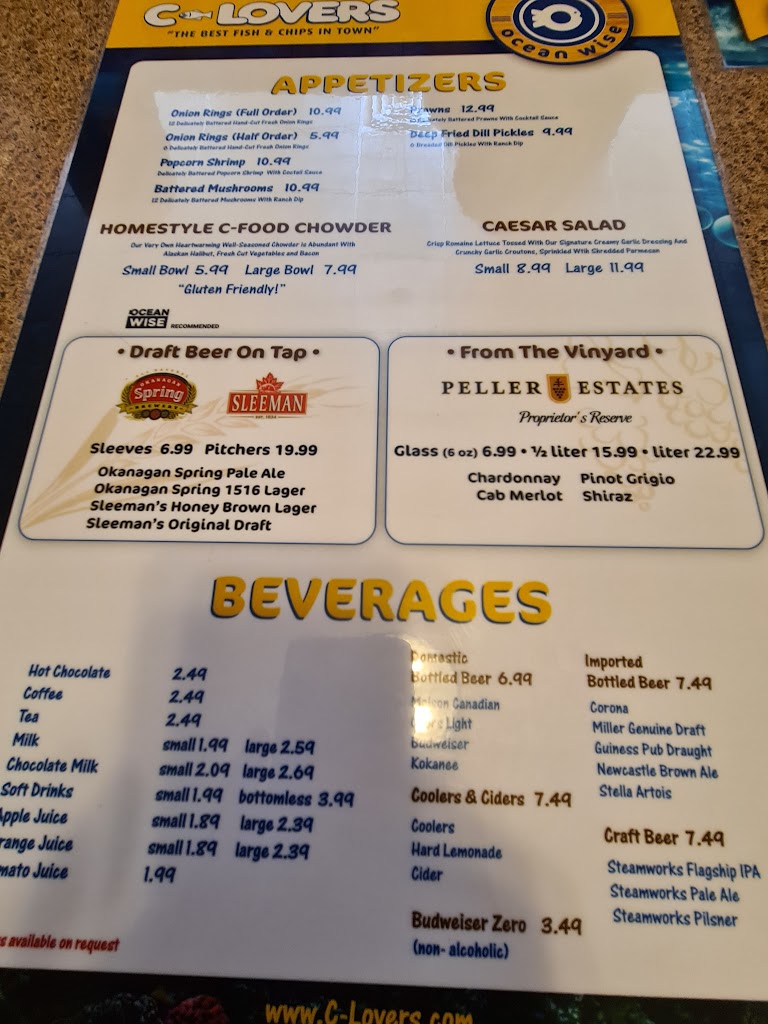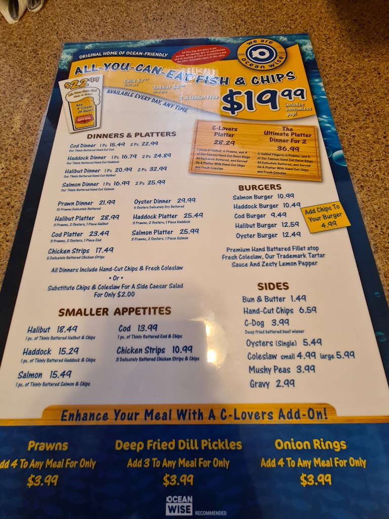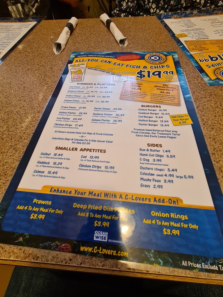 It was my 107th eatery in Vernon on my quest to eat at every eatery in Vernon. My parents and I came here for the very first time ever. For the sixth time in this quest, I decided to eat meat. C-Lovers is the worst restaurant for vegetarians in Vernon. Other than appetizers, there aren't any vegetarian main dishes. You would be limited to onion rings, deep fried pickles, battered mushrooms, peas, coleslaw, etc. However, it's definitely doable if you do two appetizers. You can do All You Can Eat Fish and Chips for $19.99. It includes unlimited soda refills. We also shared Deep Fried Pickles. They aren't as good as Sir Winston's, but they were still delicious. My mom had the halibut platter and my dad had the cod platter. All three of us were really happy with our meals. We like that everything was lightly battered and the ranch sauce goes great with it. The venue is much bigger than we anticipated. It also leans to a much older demographic amongst customers. The server was super friendly. The venue was very clean. Although we paid everything on a single bill, I estimate my All You Can Eat meal including unlimited soda would be $23.60 after tax and a 15 percent tip. Restaurant complete. Highly recommend! 107 down. 50ish to go.
