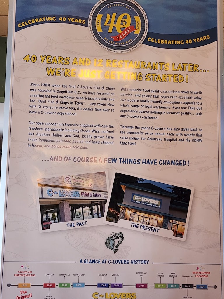 We first tried C lovers in Vernon many years ago. The food and service was fast and great. We were very happy when one opened up in our city too. (Kamloops). We often get the platter for 2 with halibut, onion rings, shrimp and fries and we usually have extra to take home after. We love the deep fried pickles too. Fast, friendly service.