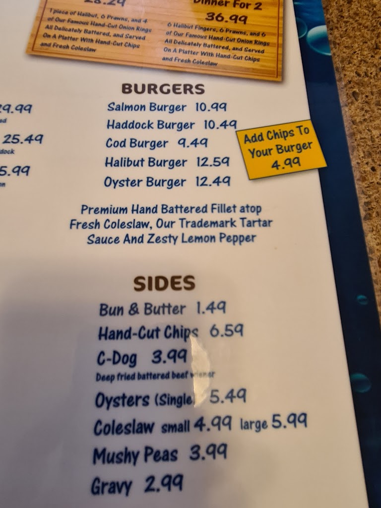 I love this place! How can you be disappointed with anything on the menu??? Incredible food, incredible menu, fantastic service, reasonable pricing and great atmosphere! I love the all you can eat deal for $19.99 you can enjoy great fish, great fresh cut fries and phenomenal Onion Rings!!! If you haven’t tried the onion Rings you are missing out on an incredible experience! The Salmon Burger is off the charts! Wow what a great item, super tasty and yummy beyond belief! The Halibut is incredible and it’s always a toss up between the Halibut and the all you can eat! Great place!