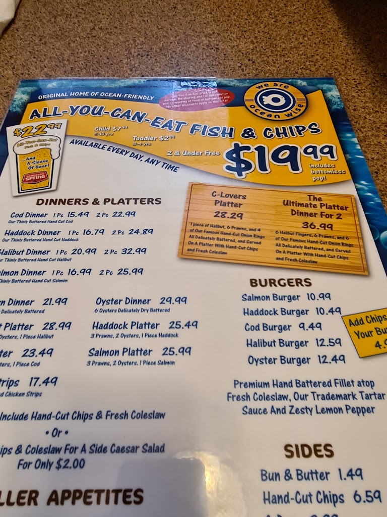 Being from alberta was looking for bigger pieces of fish for all you can eat on the first serving, tartar sauce was better than alberta