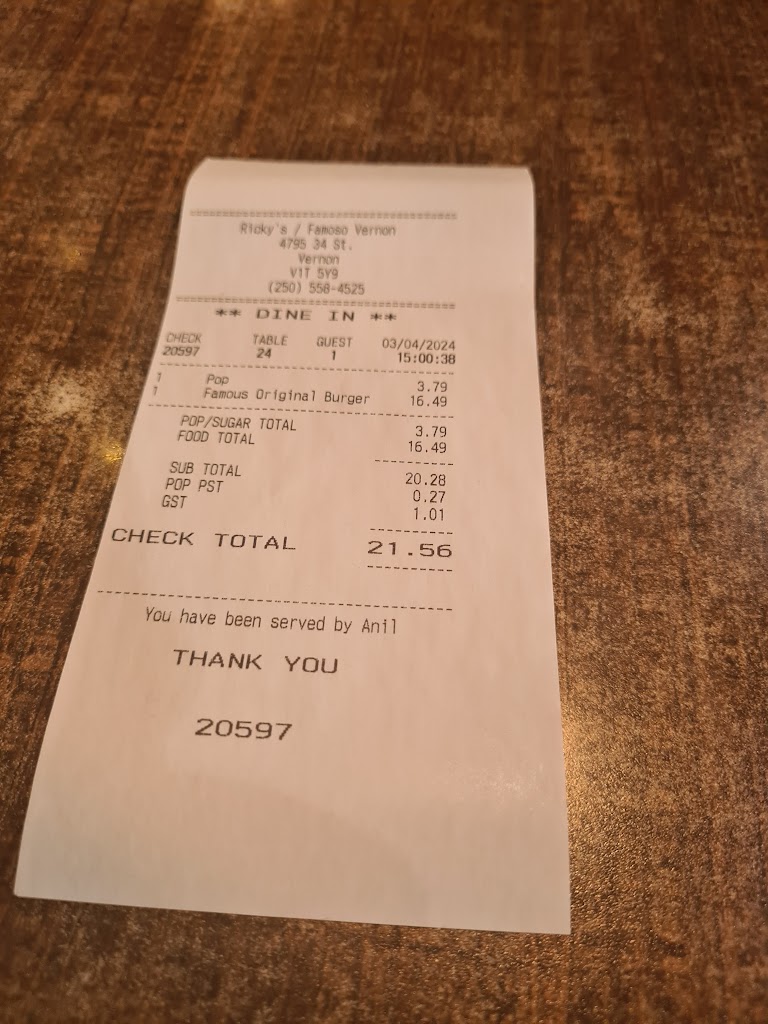 Eatery #162 in Vernon: Ricky's. Over ten years ago, I stepped into Ricky's for an aunt's birthday dinner. I had the absolute worst burger and French fries of my entire life. The Fries tasted like they were McCain Superfries that were thrown into a microwave. I never came back to Ricky's for over a decade. . .until yesterday. Ricky's is under new ownership. A couple months ago I tried Famoso's Pizza rather than the Ricky's menu. However, I braved it and Ricky's now had the chance for ultimate redemption. And. . .they are redeemed! Yes, the only other customers left 10 minutes after my arrival, but the service was really really good and the French Fries tasted a thousand times better. The waiter/owner actually pointed out the prices of the possible add ons for the burger. He was very friendly. I paid $25.44 for the classic burger and fries with unlimited soda refills after tax and an 18 percent tip. Bathroom was very clean too and the sink had hot water. They have three personal gender neutral bathrooms like you'd find at most spots in Kelowna. Ricky's has had the absolute worst reputation in Vernon for years, but under new ownership I think this place can actually hold its own now. Feel free to give this place a try. Things are different now.