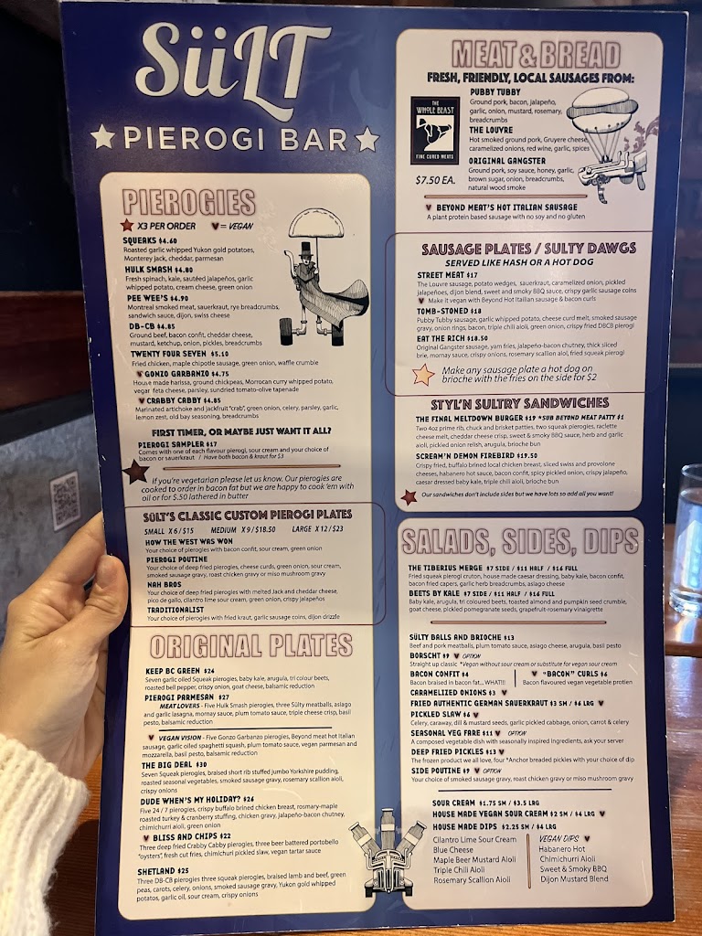 We LOVE Sult. Borscht is better than my grandmas and the pierogis are outstanding. Excellent fries too. Super easy to be vegan here and Troy (the Owner) is cool and friendly. Its a favourite. PS BEST FRIES IN VICTORIA!