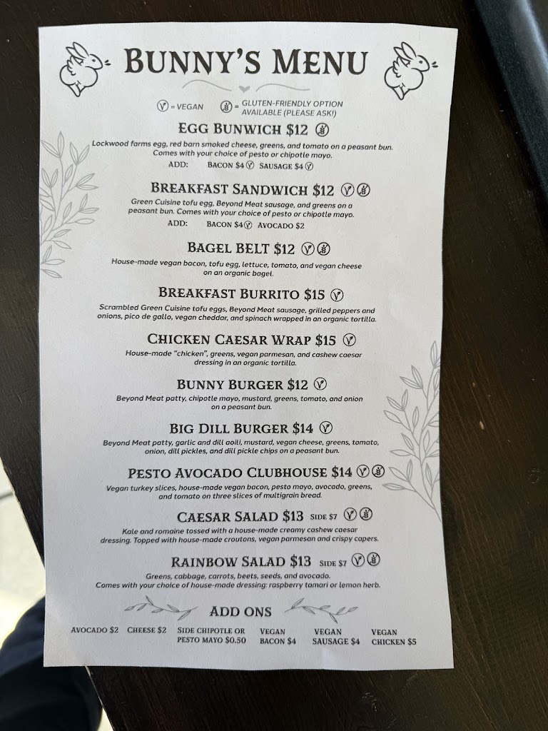 I finally got to Bunnys this morning for the first time ever and it did not disappoint. I ordered the vegan breakfast sandwich and it was, hands down, the best thing Ive eaten in a long, long time. Super flavourful and filling! My husband had the vegan breakfast burrito and absolutely devoured it! Plus I grabbed a vegan/gf chocolate hazelnut cookie to go and it was bananas! We will definitely be back!