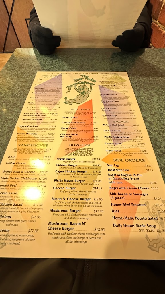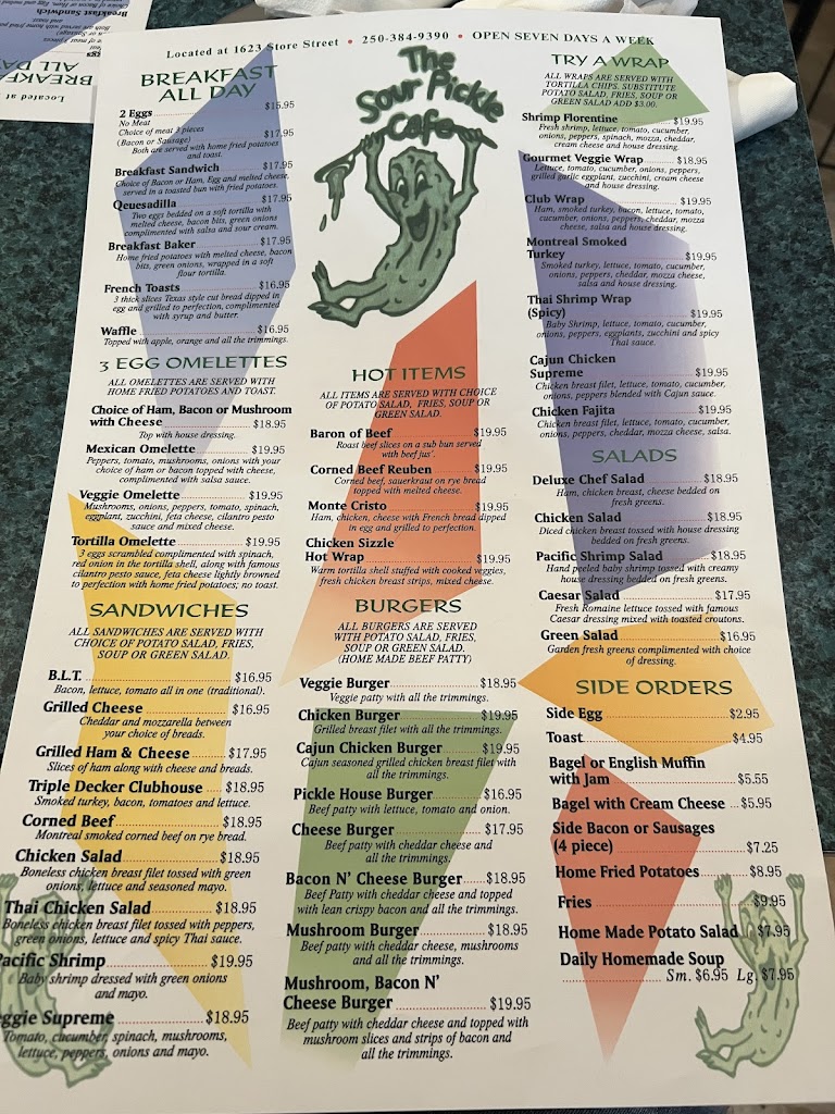 I had breakfast at the cafe on a recent trip to Victoria and had a very pleasant experience. Would highly recommend for a home cooking experience The location is very central - right at Johnson Bridge Store Street - close to the harbour, shopping, Chinatown. I had the breakfast with scrambled eggs sausages and toast. Everything was made from scratch (just like home cooking!) fresh and delicious. Portions were generous. Just hit the spot. In addition the coffee is bottomless cup. It’s a family run cafe and service was courteous and friendly. The decor is very whimsical and cheerful with special place for pickle decorations 😀. There is a small outdoor seating area for nicer weather days. Very reasonably priced and a much cozier, friendlier start to the day than at bigger restaurants in the area. There were regulars when we dined there which added to the cozy ambience.