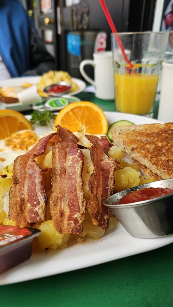 Very good place to have breakfast. No line up but steady busy. Our meal was good. Lots on our plate. We were both full after eating our meal. My husband had an omelette and I had bacon and eggs. Both came with toast and fried potatoes. Also had coffee and an orange juice. Served quickly. A little expensive at $62.00, but that's what it costs these days. She gave us coffee to go as part of our meal.