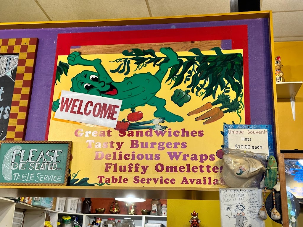 Don t be fooled by the clever name. The only thing that is more sour than a pickle is me right now. There was a shelf of kids books beside my table, all related to pickles and I wanted to see the titles, but was quickly scolded and told not to touch them because of covid. There was no pickle related foods except one sandwich with pickles on it. I asked for extra pickles and it came with 2 coin sized pickles and I was charged extra.