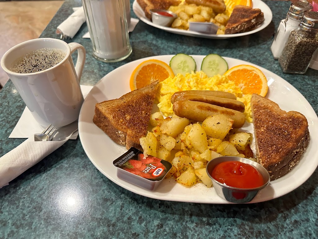 Service was very good. Followed up on food and coffee, not watered down coffee either, friendly service. I had the 2 eggs and Sausage. The eggs were perfectly cooked overeasys. The bread was bland and I got a little packet of kraft strawberry jam without any offers for other kinds. Potatoes were bland and dry. Like something I make in a rush at home because Im late for work. Breakfast sausage were a descent breakfast sausauge like something you get at coras. Overall its a place I would eat again if joining others but not gonna choose this as a place I love to eat at or that I would return because I want breakfast.