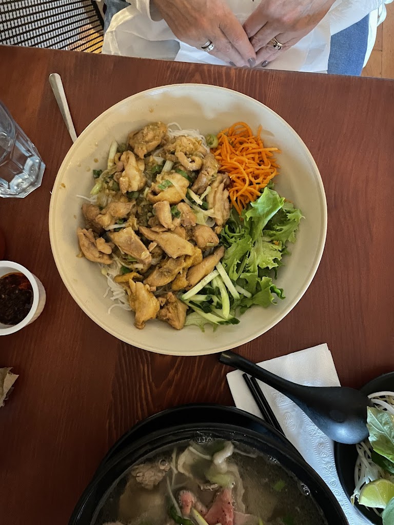 The vibe was great, and the service was excellent. The combo was a fantastic deal, especially with the delicious fried spring rolls. Unfortunately, the salad roll didn't quite hit the mark, as it had a strong mayo flavor in the peanut sauce. The duck noodle had good flavor, but the meat was a bit tough and chewy. The satay pho was tasty, as were the other pho dishes. The meat quality was top-notch, although the broth leaned on the sweeter side and could have used a bit more depth in flavor.