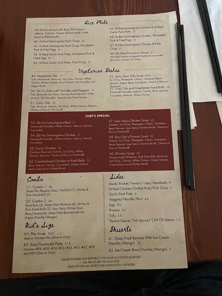 Dinner for two: $70 including tips Postive: nice decor, clean bathrooms, clean tables, great selection of food, delicious as the one in Langford. Negative: No fish sauce. Food for thought: there are two sitting areas, upstairs and downstairs. Upstairs is perfect for date nights or somewhere quiet while eating. With upstairs is that the staff rarely checks on you. Maybe it is meant to be self serve dining. They should leave a few jugs of ice water if that is the case. If you want anything like utensils or extra napkins, there is a cart upstairs that you can grab from.